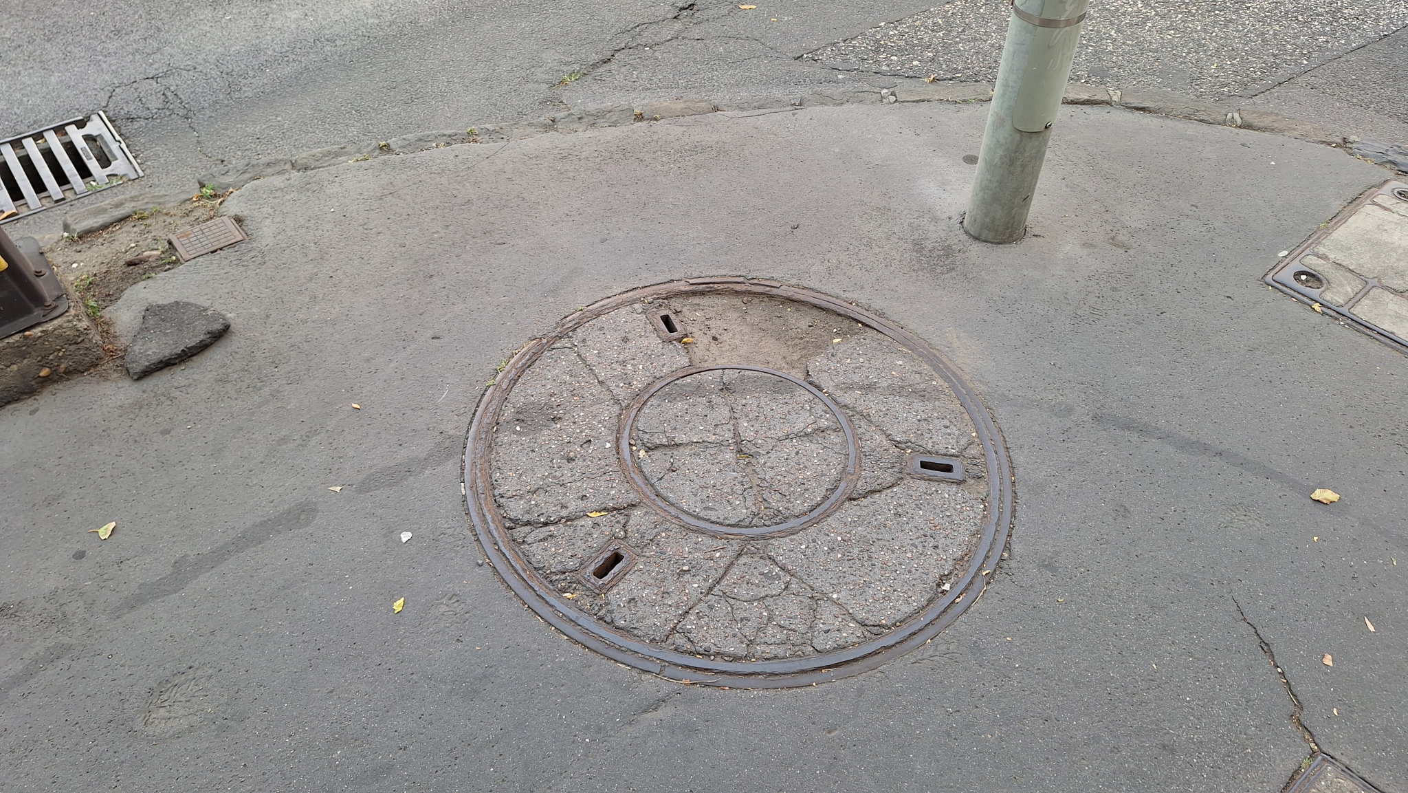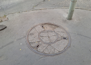 A Dózsa György út és Szondi utca sarkánál lévő aknafedél egyik körcikkejéből hiányzik az aszfaltburkolat.