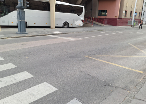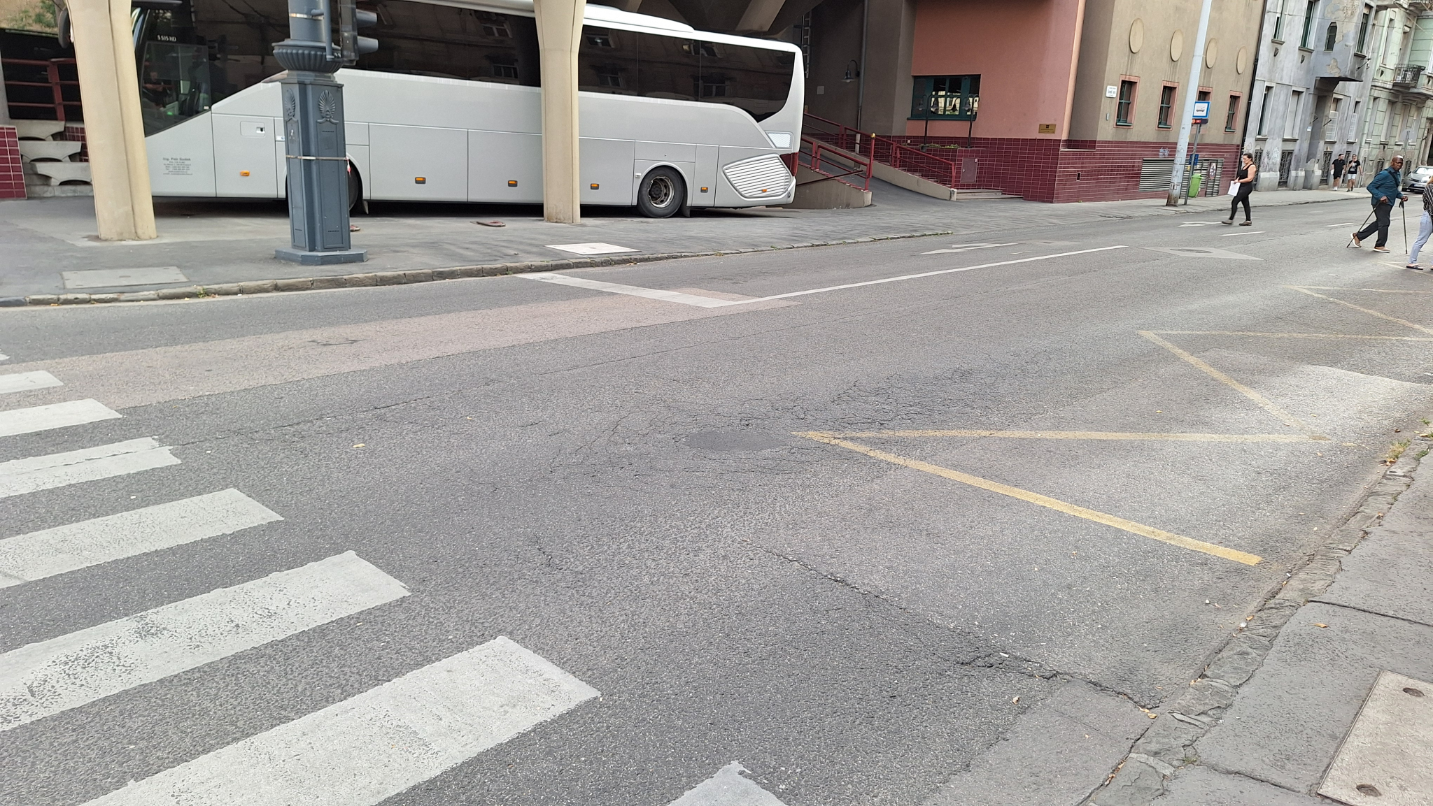 A Dózsa György út és Szondi utca kereszteződésében lévő zebra előtt van egy kátyú.