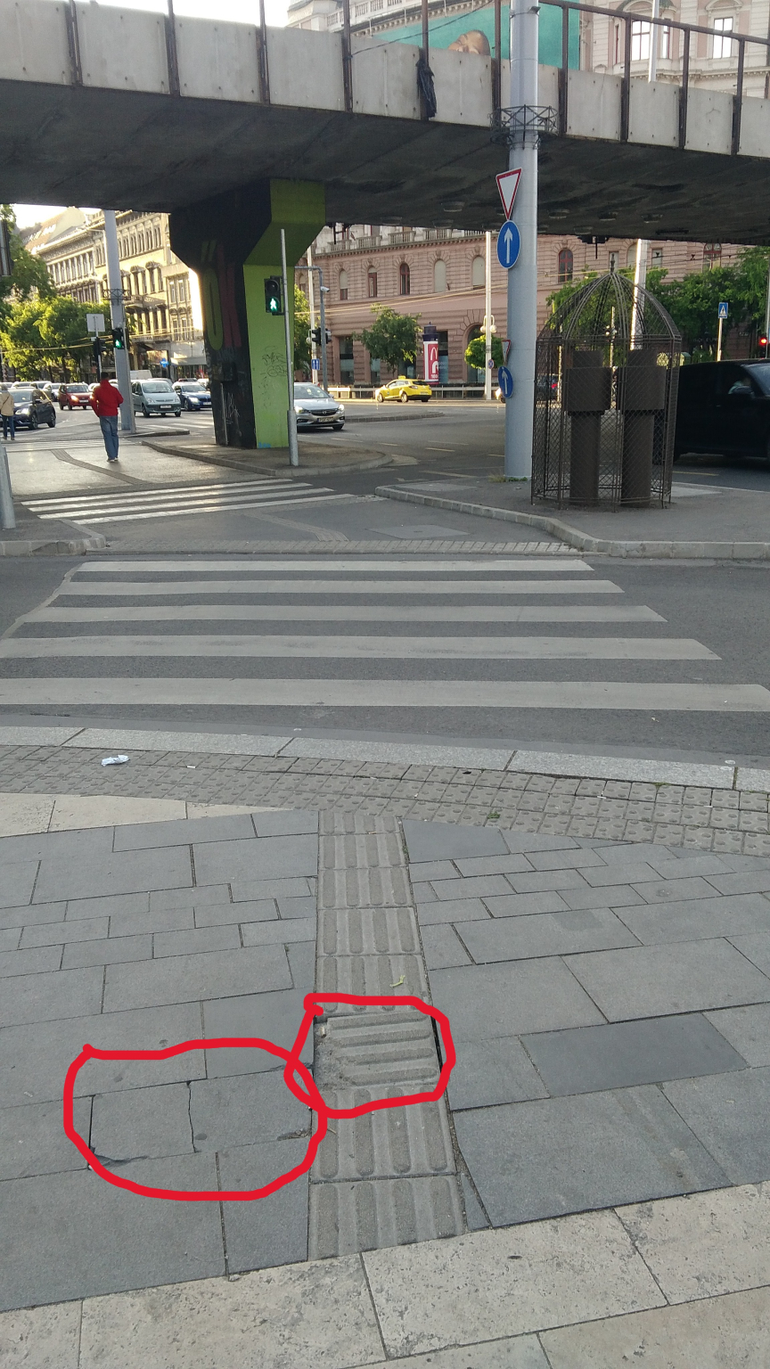 Kérem az illetékest, hogy a képen látható térkövet állítsák megfelelő irányba, és rögzítsék, mert jelenleg botlásveszélyes!