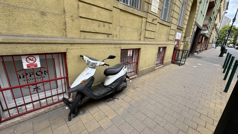 Hosszú ideje ugyanazon a helyen áll egy elhagyott robogó a járdán, beszűkítve a járda szélességét, akadályozva a gyalogosok közlekedését. Kérnénk szépen a szükséges intézkedések foganatosítását. Köszönjük