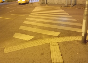 A Baross téri aluljáró B lépcsőjének tetején hiányzik pár taktilis térkő, ami így elég balesetveszélyes.