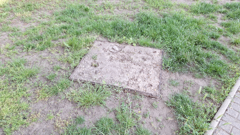 A Szent László téren a fűben van egy látszólag aknához nem kapcsolódó, leterített aknafedél.