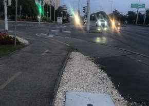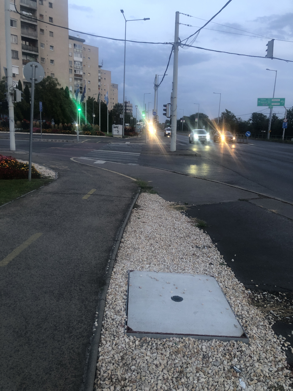 A Helsinki út és Kossuth Lajos utca sarkánál lévő aknafedefél elég rossz állapotban van. Maga a fedél porladt, a betonkerete pedig szétrepedt, hiányos.