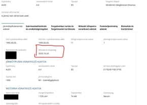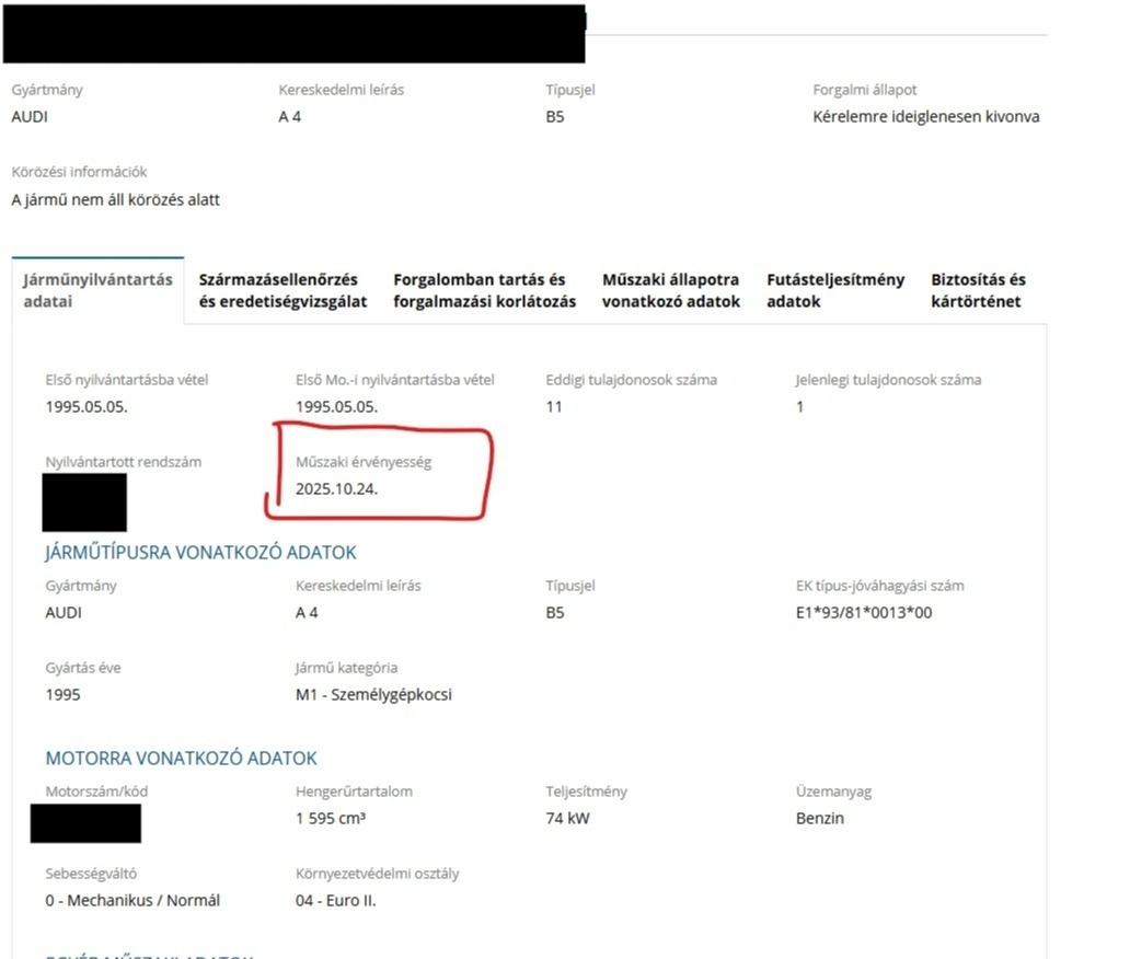 A gépjármű nem rendelkezik érvényes műszakival, 2025.10.24-én lejárt.