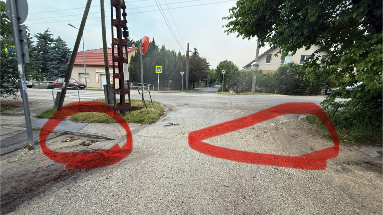A III. utca alján az elrontott, elépített vízelvezetés miatt az úttesten szép adag hordalék gyűlt össze és a víznyelő is eldugult.
