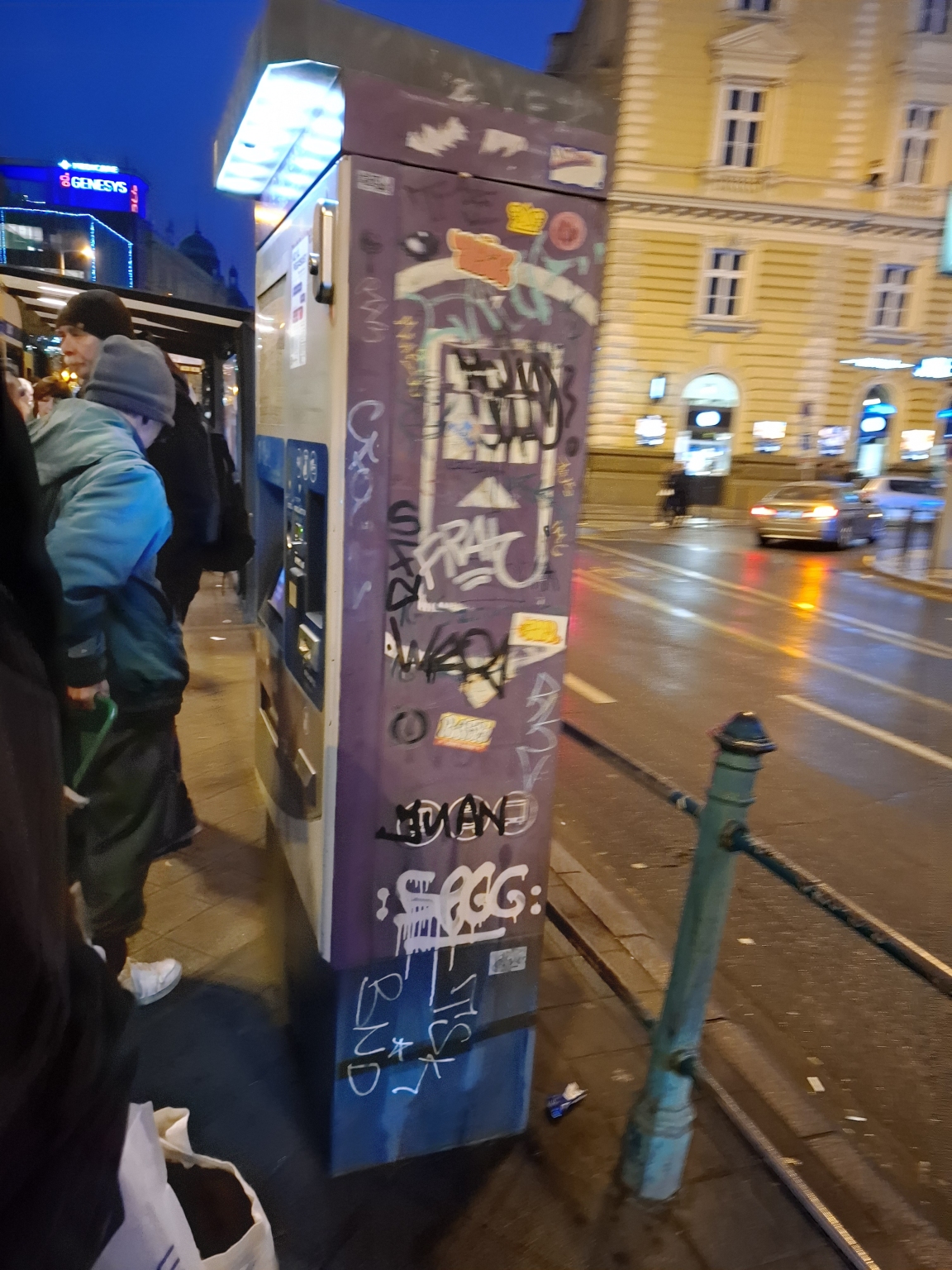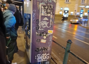 A Nyugati pu. villamosmegállónál graffitis, matricás a jegyautomata, kérem, tisztítsák meg.