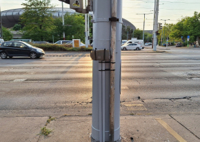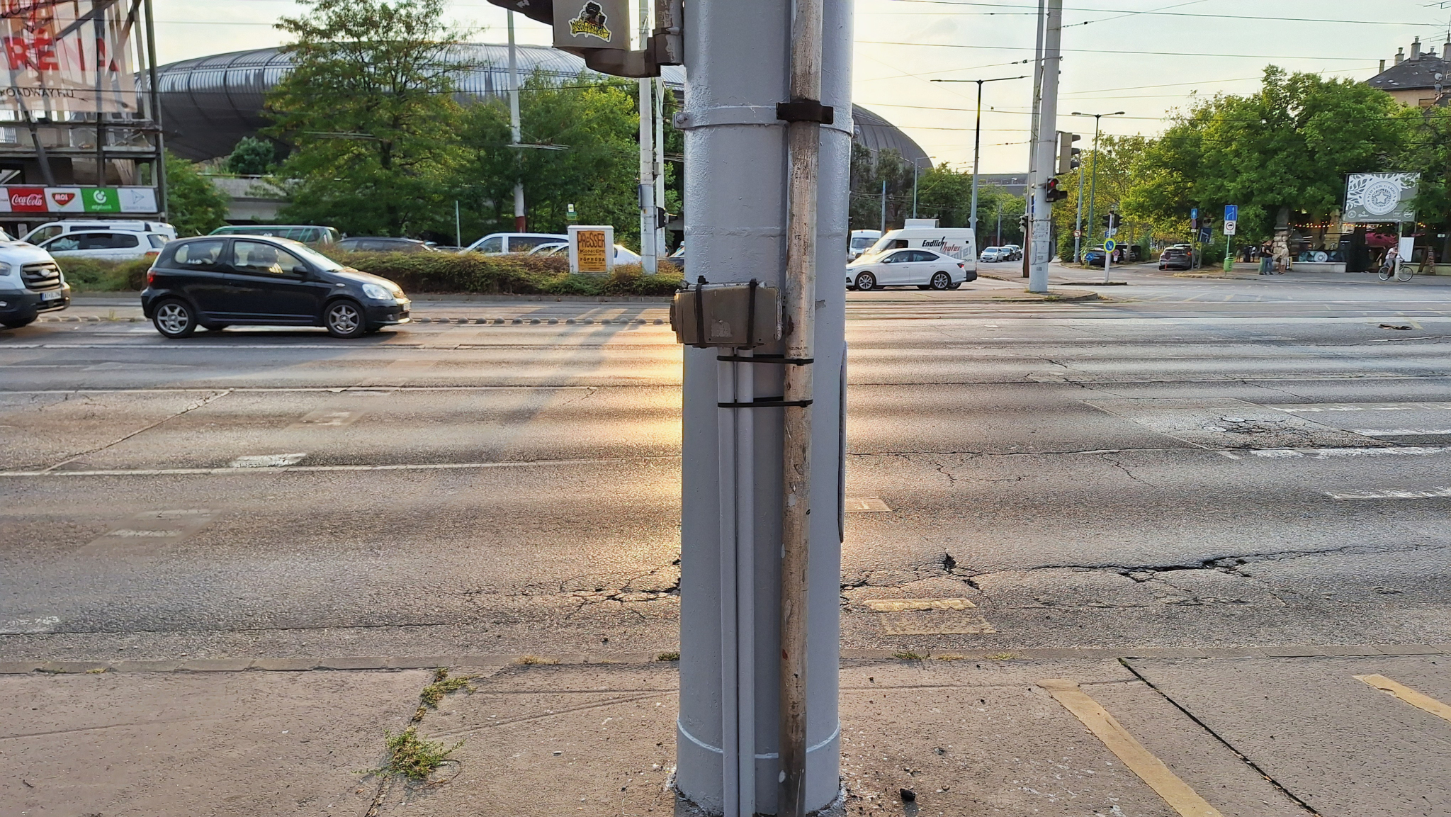 A Hungária és a Mogyoródi út sarkánál az egyik oszlopról teljesen levált az arra rögzített kapcsolódoboz.