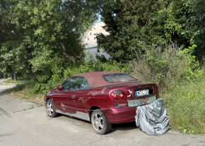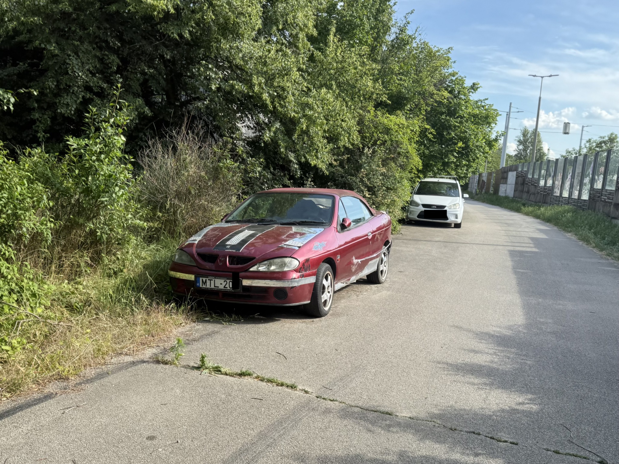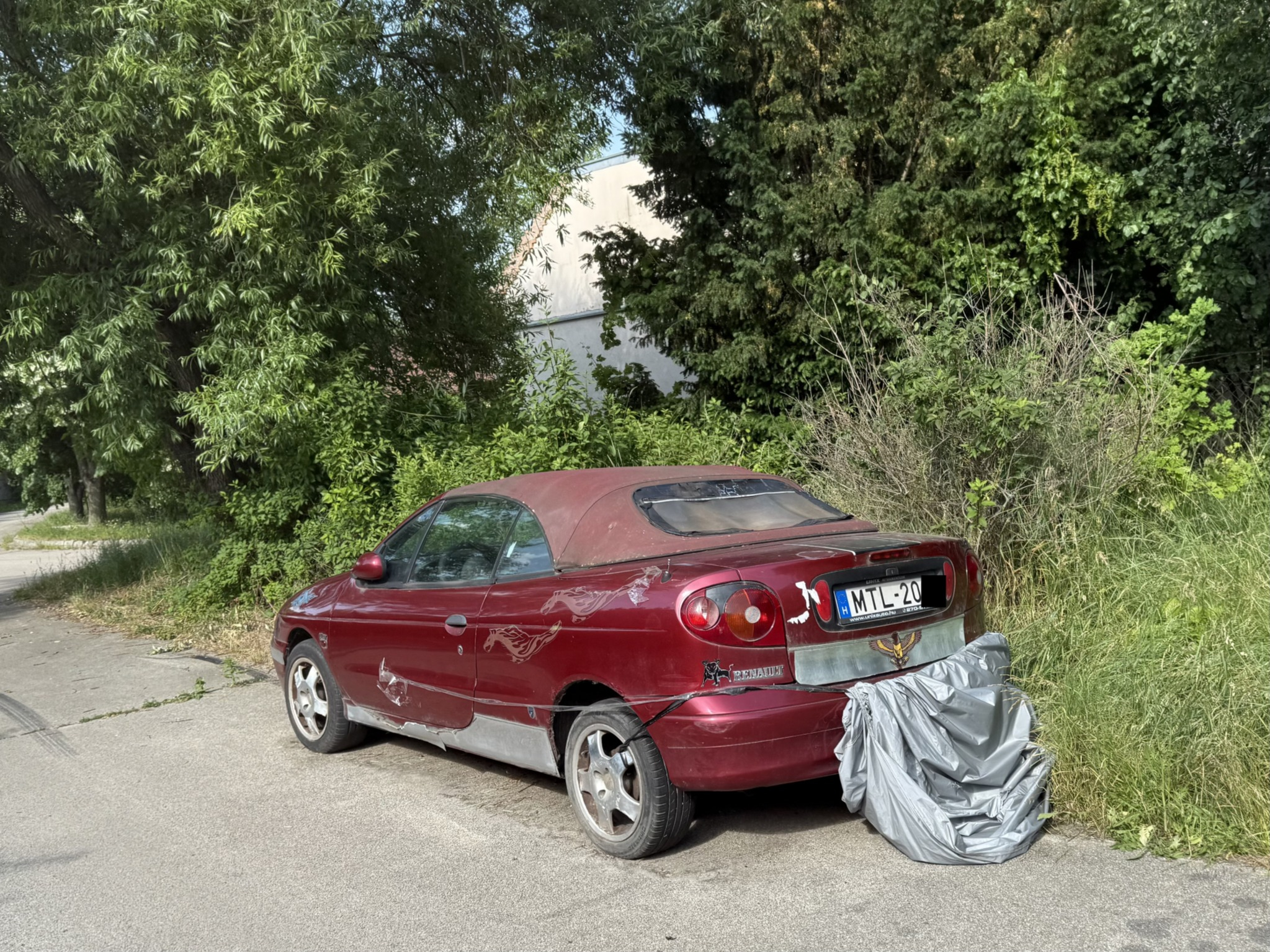 A Hajtány soron az alábbi 2, régóta nem mozduló kocsi található. Az egyik ebből gyanúsan az a Renault Megane cabrio, ami már több helyen volt letárolva a XI. kerületben. Legutóbb a Solt utcában kapott felszólítást. Még a ponyvája is ugyanez a szakadék volt. Ha valakinek ennyire nem kell a kocsija, azt adja le a bontóba. De ne a közterületet csúfítsa vele.