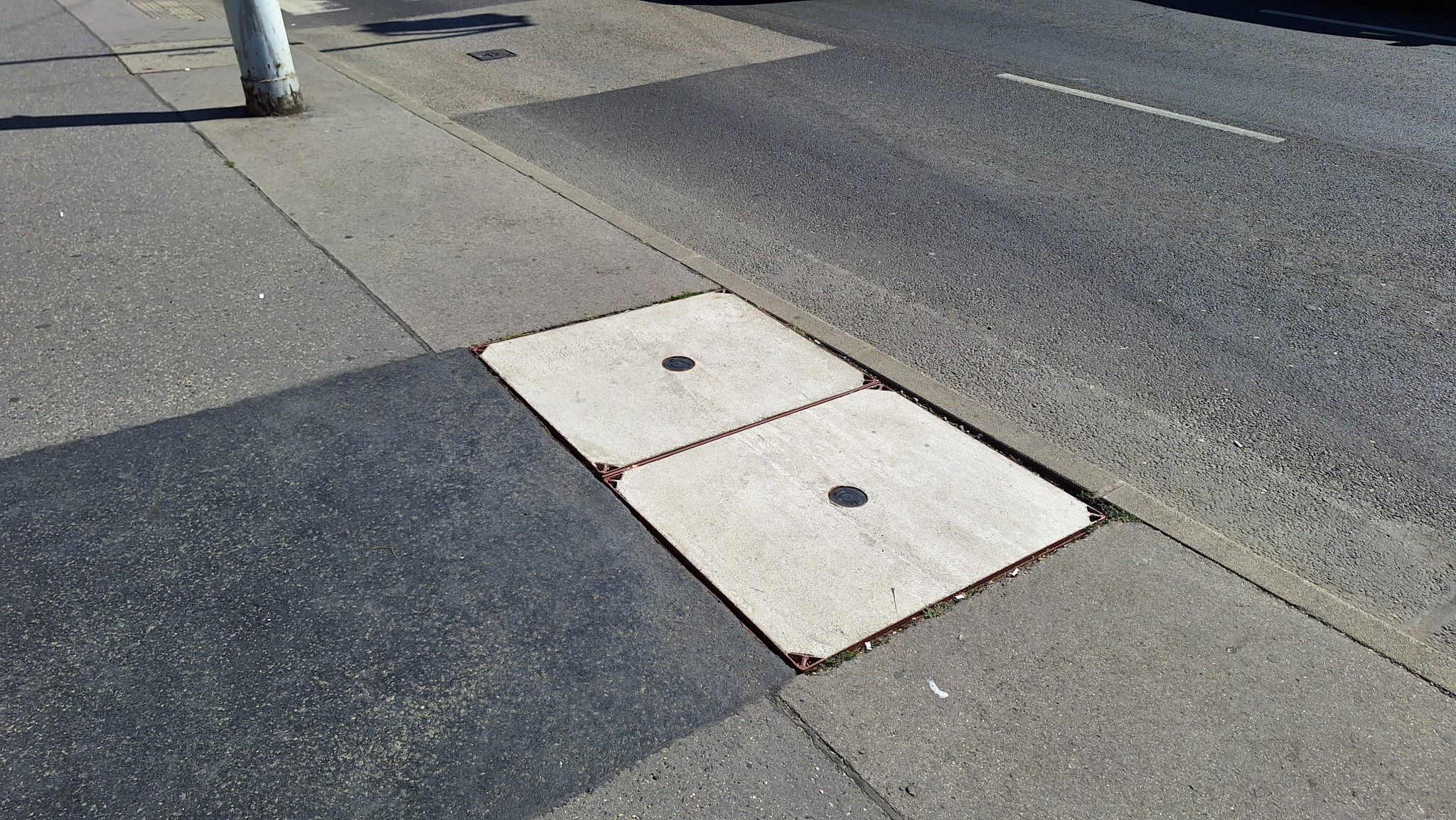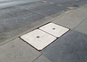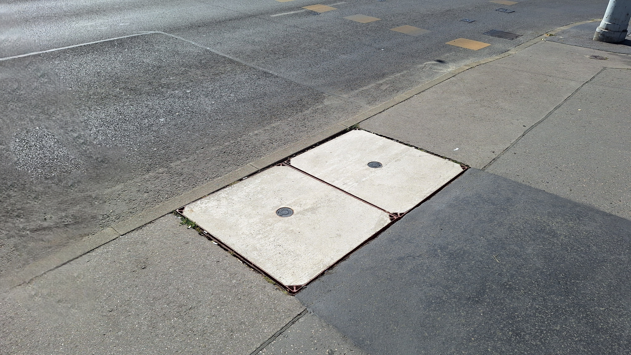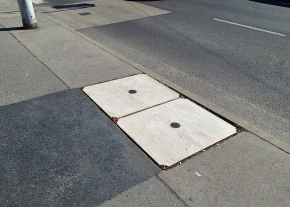A Róbert Károly körút 42. előtti két Pantel feliratú aknafedél kopott, meg is vannak süllyedve.
