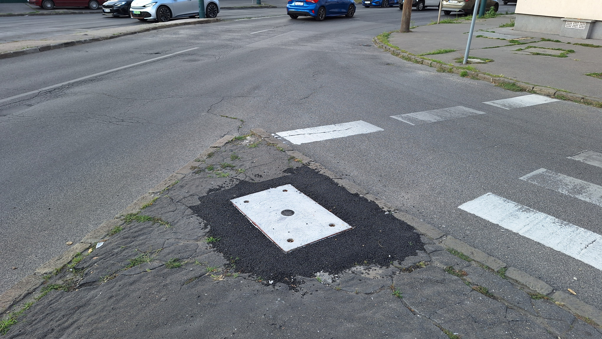 A Fogarasi út 1. előtti járdaszigeten van egy lyukas, megviselt aknafedél.