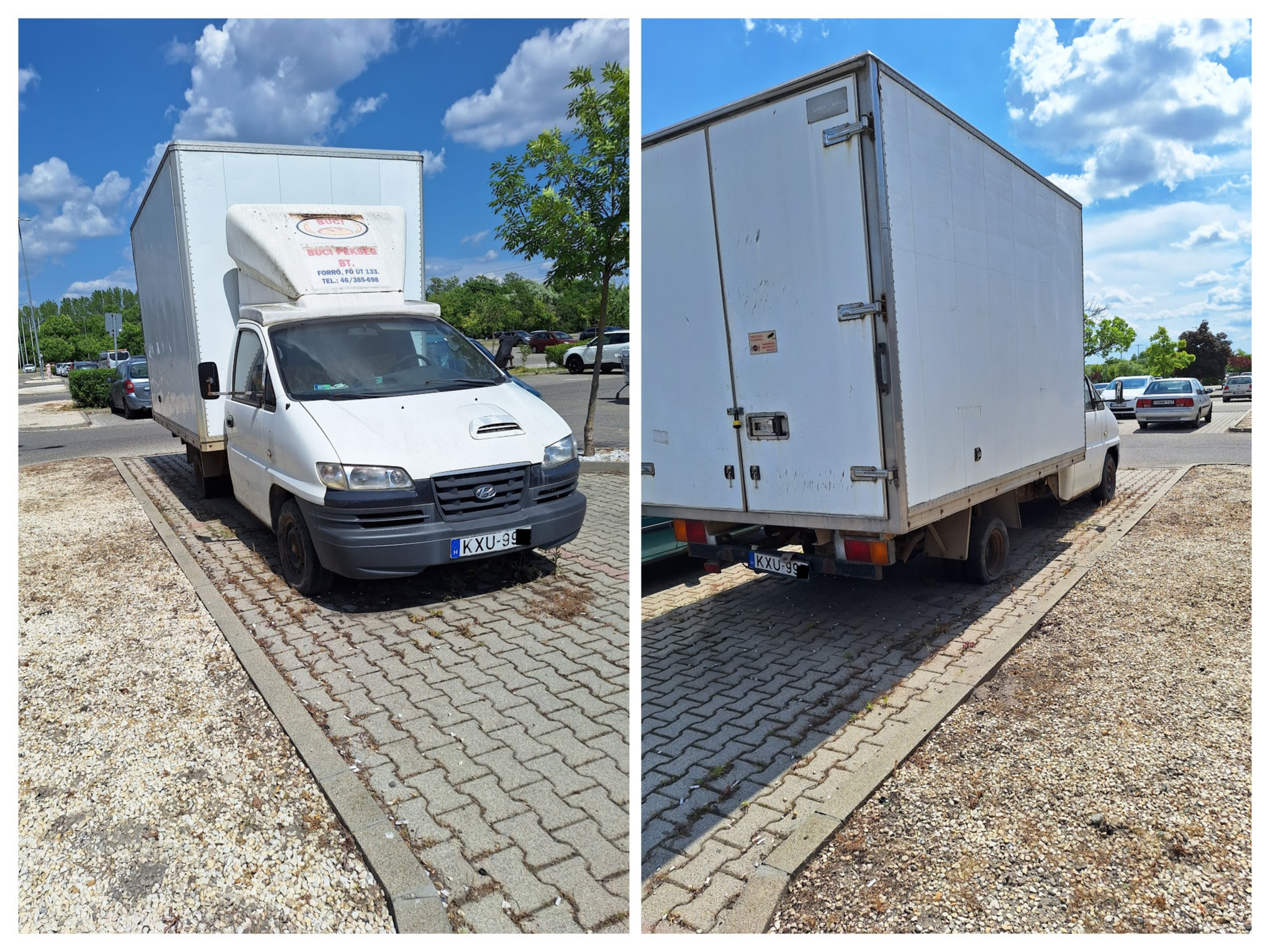 A Google Street view tanúsága szerint is legalább 1 éve áll a pesterzsébeti TESCO az képeke látható két jármű. A teherautó valamikor még a forrói BUCI pékségé lehetett (hivatalból kivont státusz, 5,5 éve lejárt műszakival). A másik egy külfüldi (MD - Moldova) jármű.