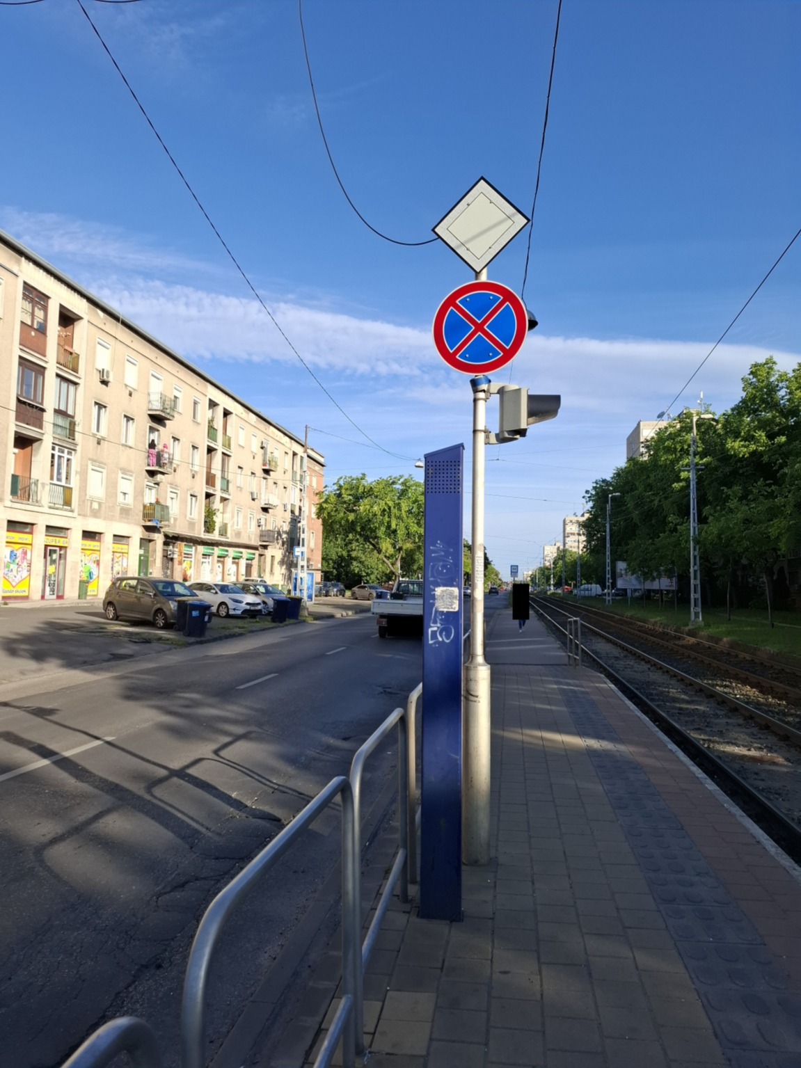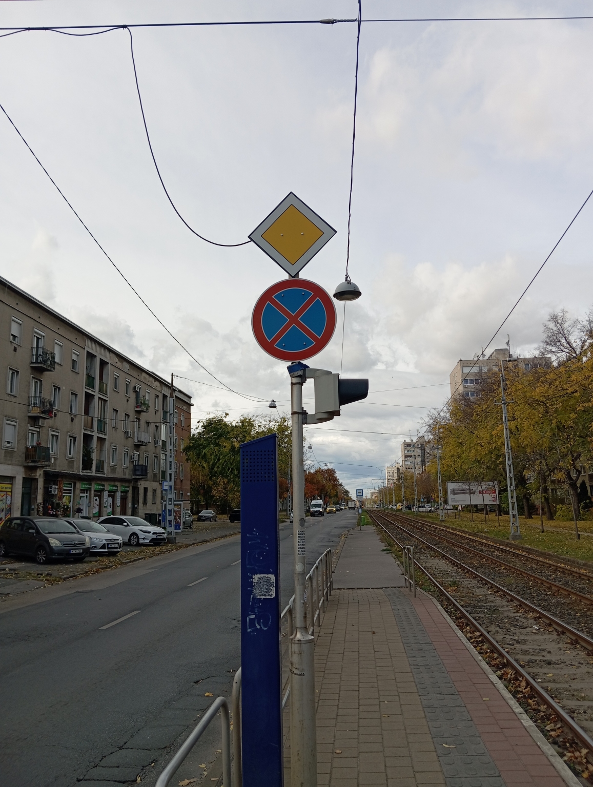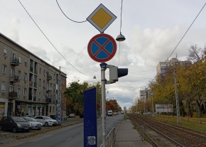 A Pongrácz Gergely téri villamosmegállónál álló közlekedési tábla színe kifakult.