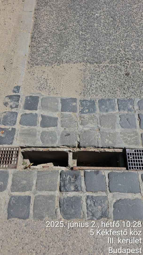 Az úton lévő vízelvezető rongálódott a karbantartás hiánya végett.