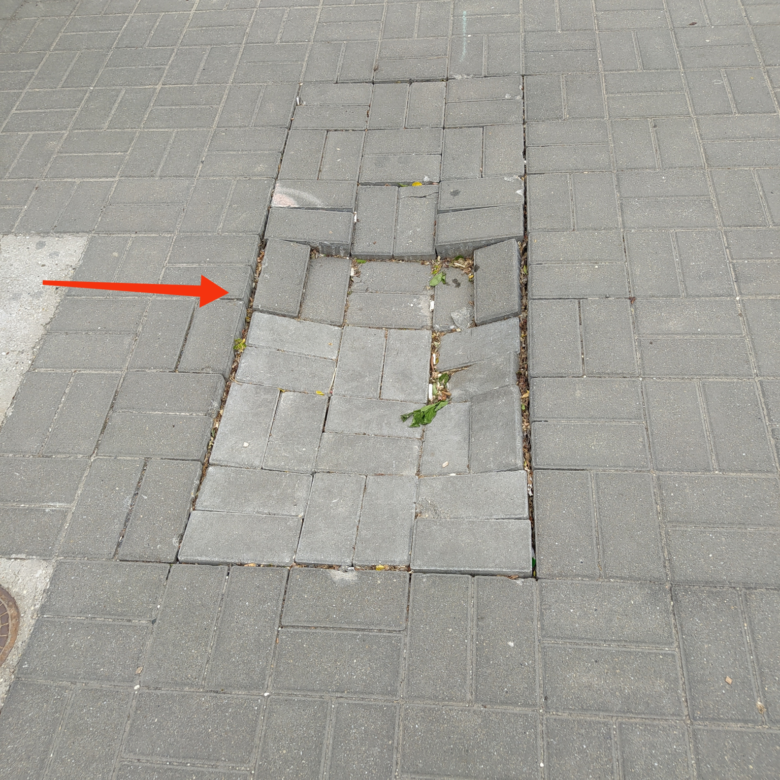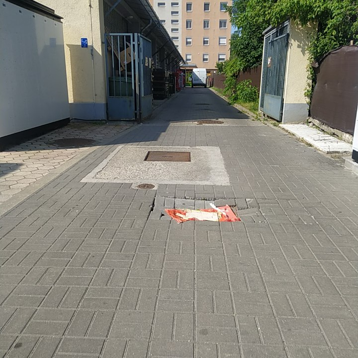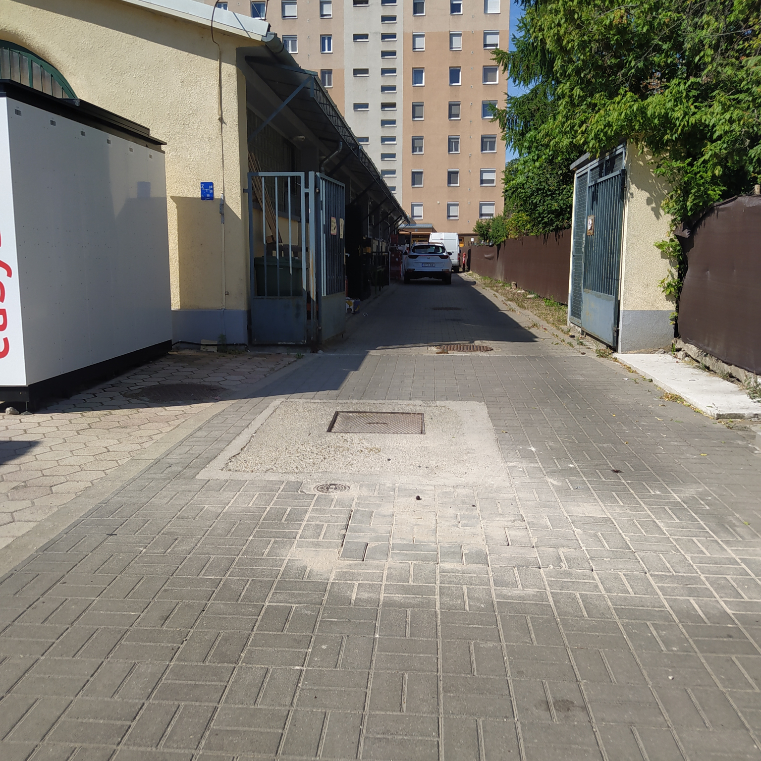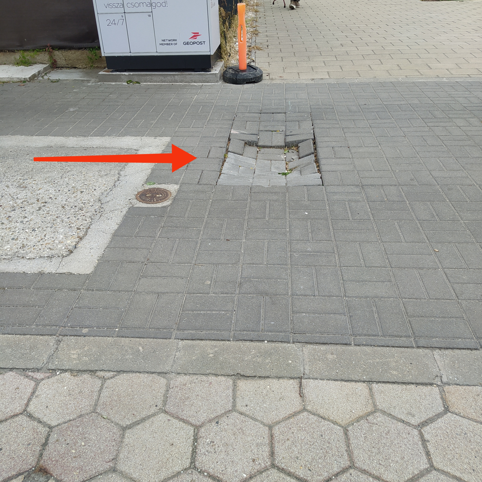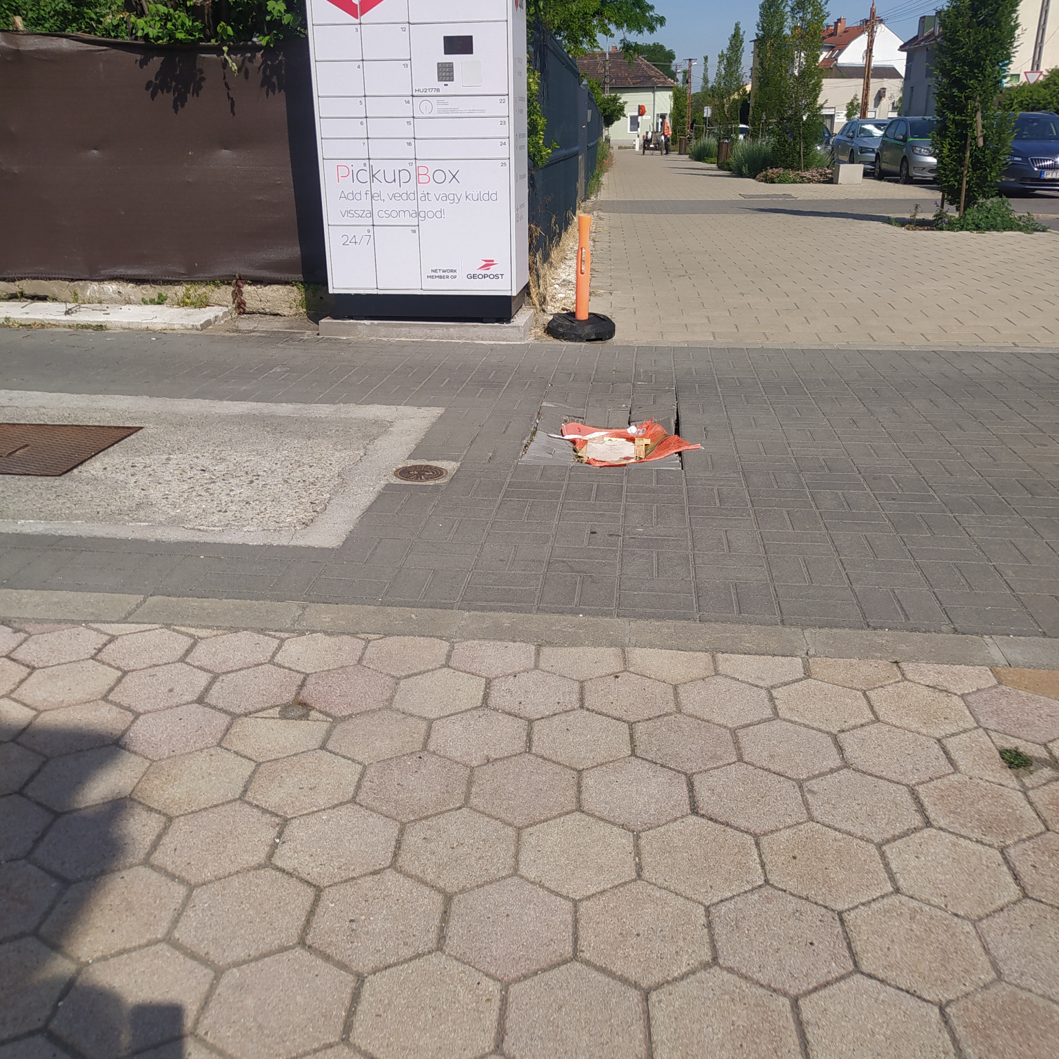 A burkolat süllyedése feltételezhetően a csomagpontok telepítése során végzett munkálatoknak a következménye, továbbítottuk a bejelentést az üzemeltető Csapi-15. Kft. részére.