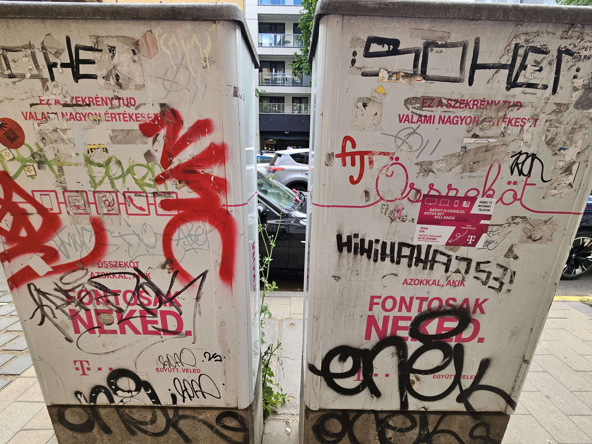 Egy Magyar Telekom műszekrény található a Mester utca 50 előtt, graffitivel, matricákkal, hirdetésekkel.
