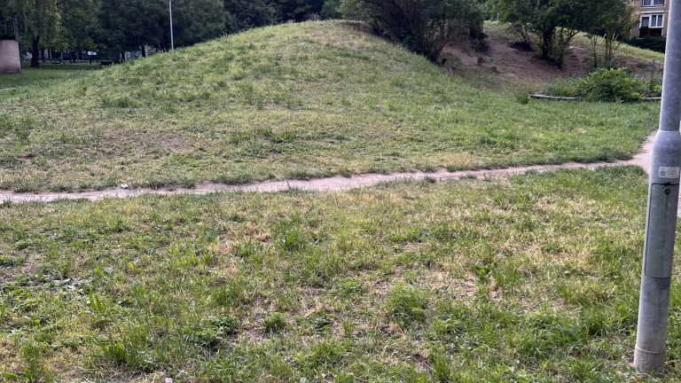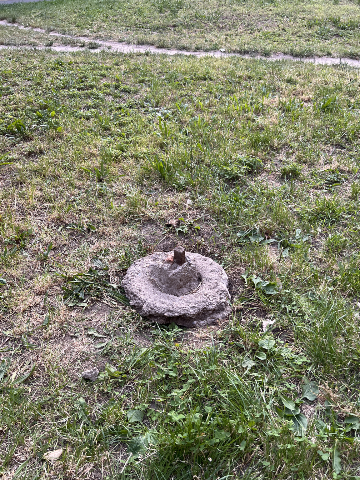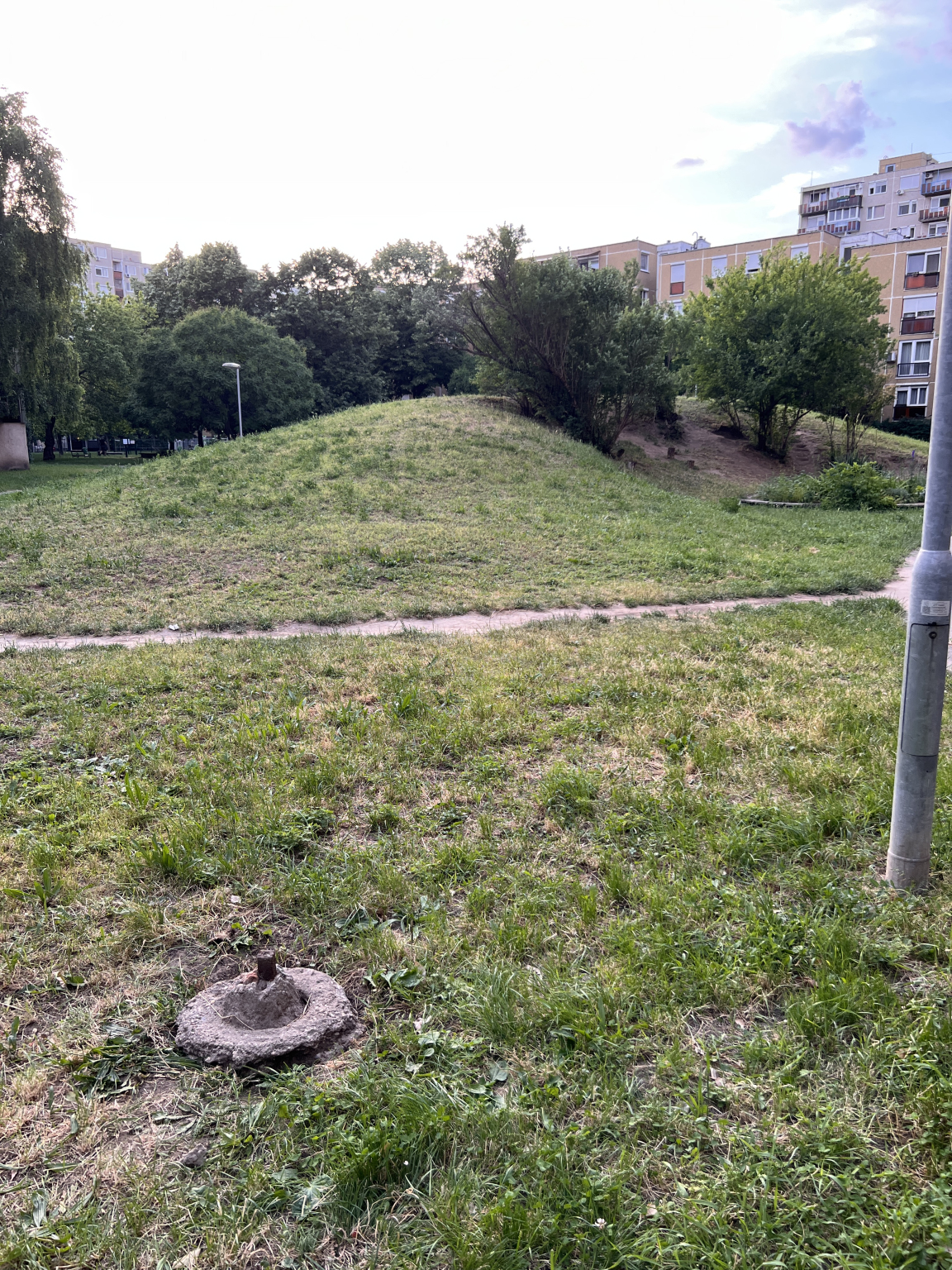 Kérem szépen a képen látható fémcső és beton eltávolítását. Zöld területen van, ahol nagyon sok gyerek játszik
