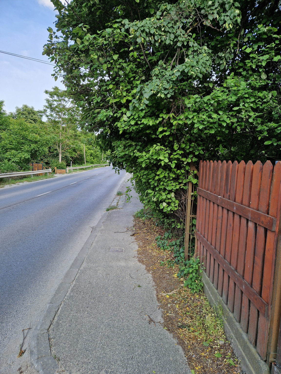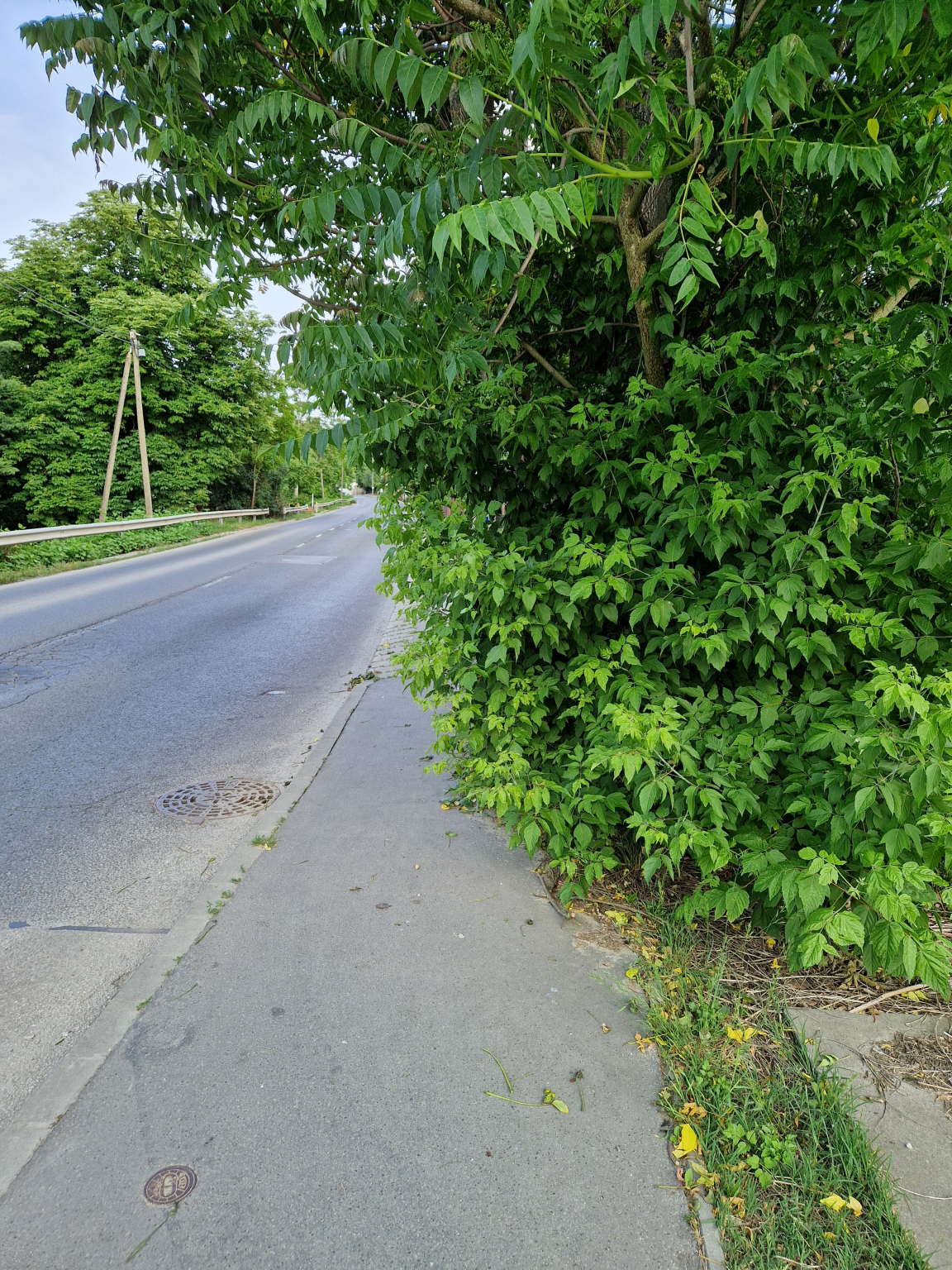 A Hidegkúti úton az egyébként is szűk járdát már több helyen majdnem teljesen benőtte a növényzet, ezért már az áthaladás is veszélyes a főút közelsége miatt.