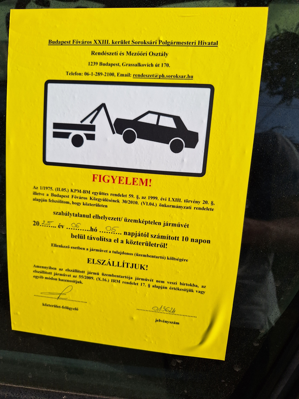 „Szeretnék érdeklődni a XXIII. kerületi Rendészeti Osztálynál, hogy mi történt a gépjárművel kapcsolatosan? Ugyanis az 1 héttel ezelőtti bejelentésem másnapján már kapott is egy felszólítást a tulajdonos, ami napokig ott volt az autó ablakán. Tegnapra viszont a felszólítás már eltűnt. A gépjármű állapotában nem történt változás, ezért remélem nem fog ott állni az idők végezetéig, ahogy egy sajnos a kerületben egyre gyakoribb jelenség.”