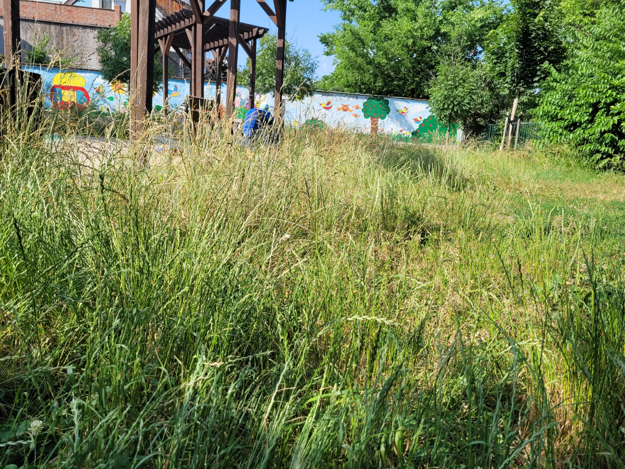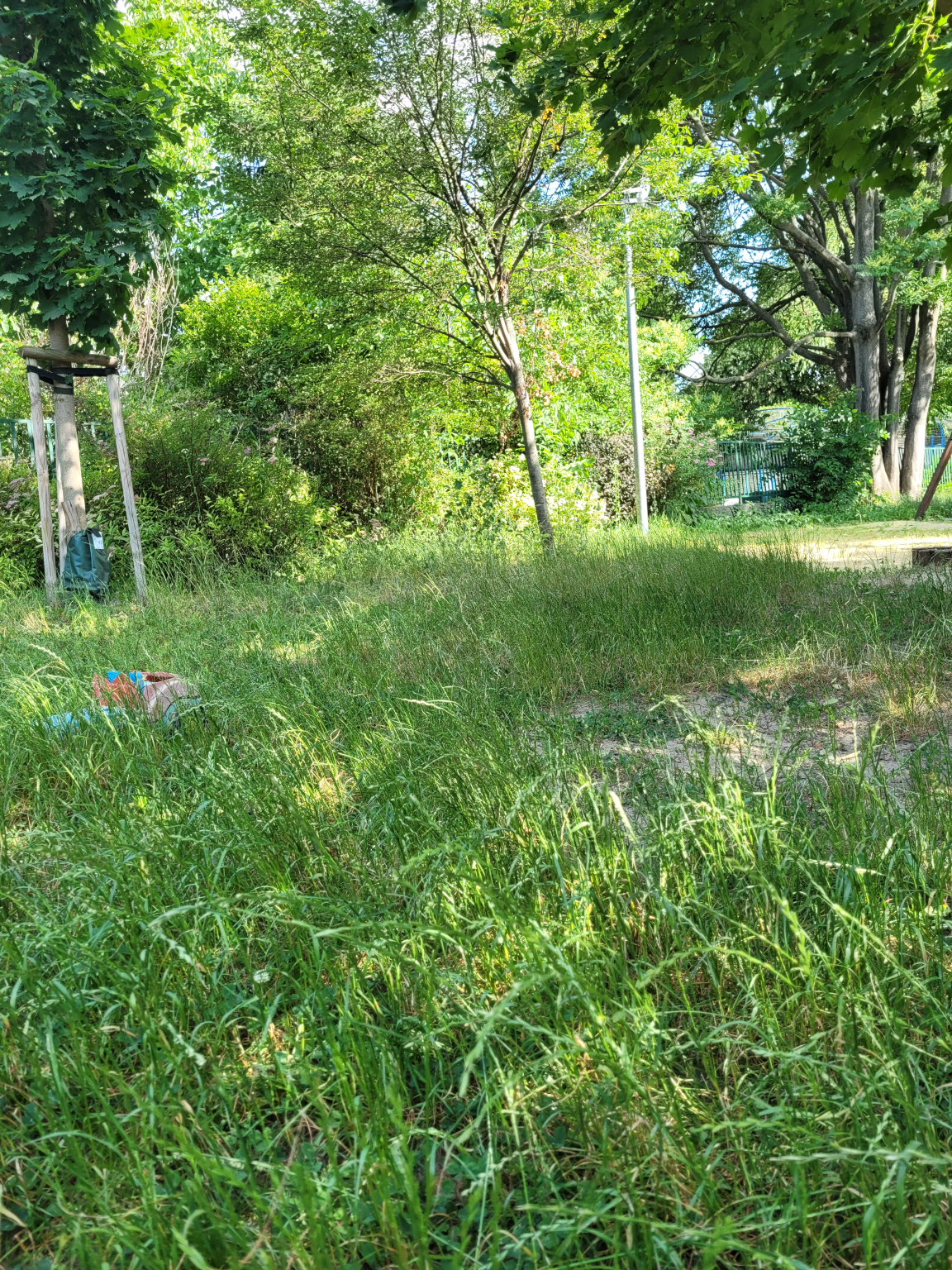 A játszótér területén végig térdig erő fű van, a füves területek gondozatlanok, ezáltal használhatatlanok. A csobogók nem működnek.