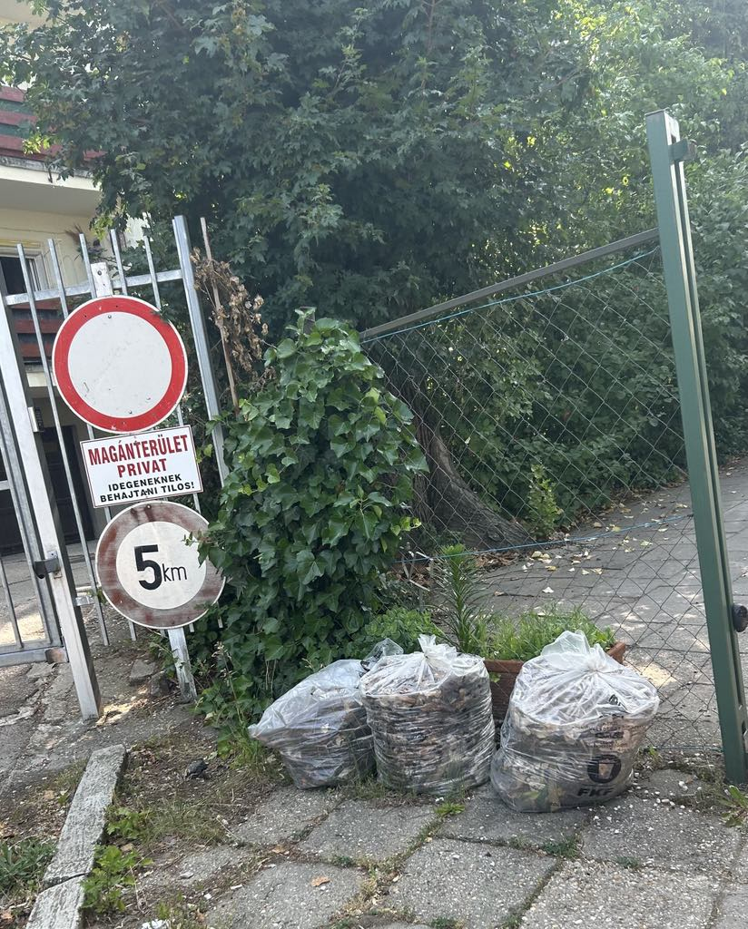 A 1026 Budapest, Tüske köz 5. szám alatt régóta hivatalos, felirattal ellátott zsákokban elhelyezett zöldhulladékok állnak.