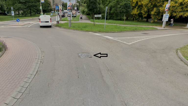 Élesen kiáll egy csatornafedél a Huszti úti körforgalomnál (a LIDL-nél). Balesetveszélyes!