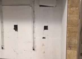 Összefirkált falak, letépett tapéta, megrongált szerencsekerék