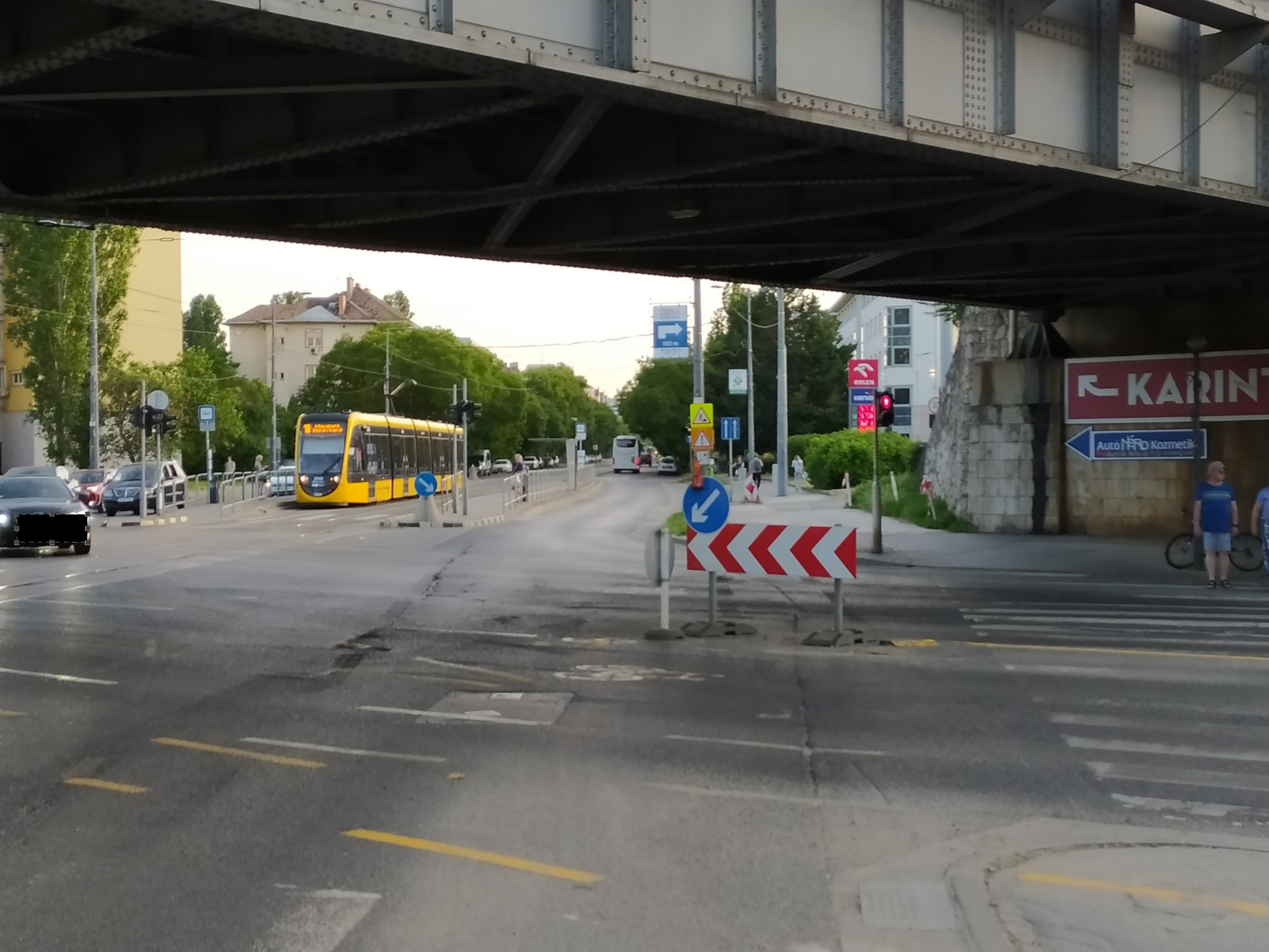 A Bartók Béla - Karolina - Tétényi kereszteződésben a pályaudvar felé az ideiglenes zebra mellé kitettek két táblát, egy balra mutató terelőtáblát és egy kerülési irány jobbra táblát. Ezek a véleményem szerint feleslegesen vannak kint, mert a kereszteződés azon pontjáról nem lehet jobbra kanyarodni, így a terelőtábla okafogyott, a kerékpározók az eltolt ideiglenes zebrát nem veszélyeztetik. Ráadásul a másik iránynak is útban van (a Bartókról a Karolina irányába). A kerülési irányt jelző tábla pedig az ideiglenes jelzőlámpaoszlopon is kint van, így azt felesleges duplázni. Ha van rá mód kérem szépen ezeknek a tábláknak az elszállítását, vagy ha ez nem lehetséges, akkor egy ennél kevésbé veszélyes kialakítást készítsenek.