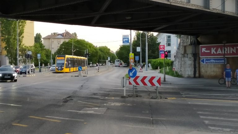 A Karolina úton a Bartók Béla úti torkolatba kihelyezett terelőtáblák a Karolina út két irányát választják szét mive...