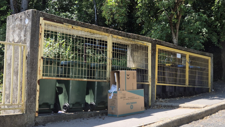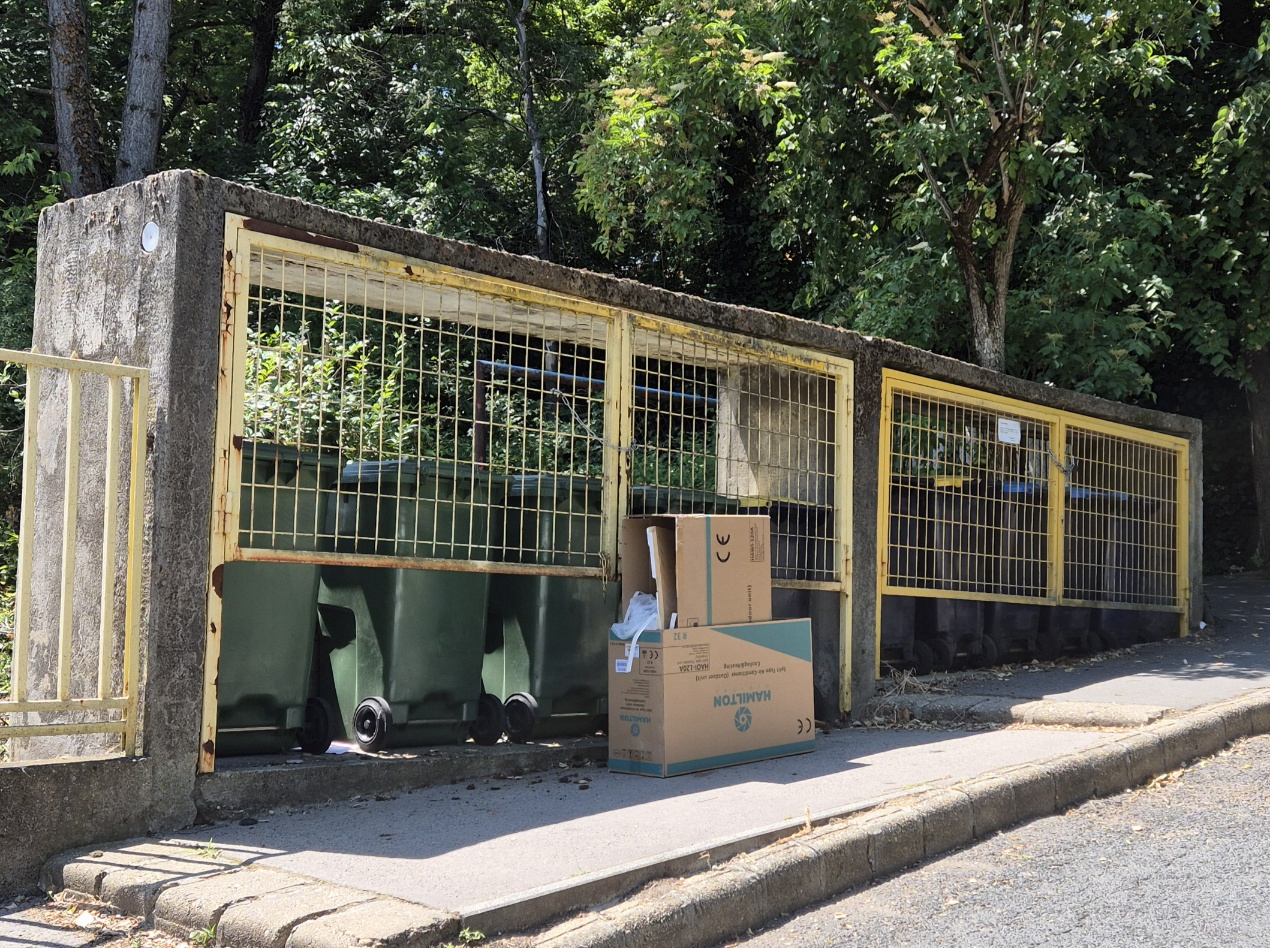 2025.06.14-én valaki egy doboznyi szemetet hagyott a Tállya u. 16-18. szeméttárolója előtt az utcán, a keskeny járda kellős közepén.