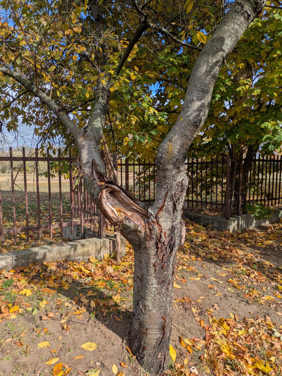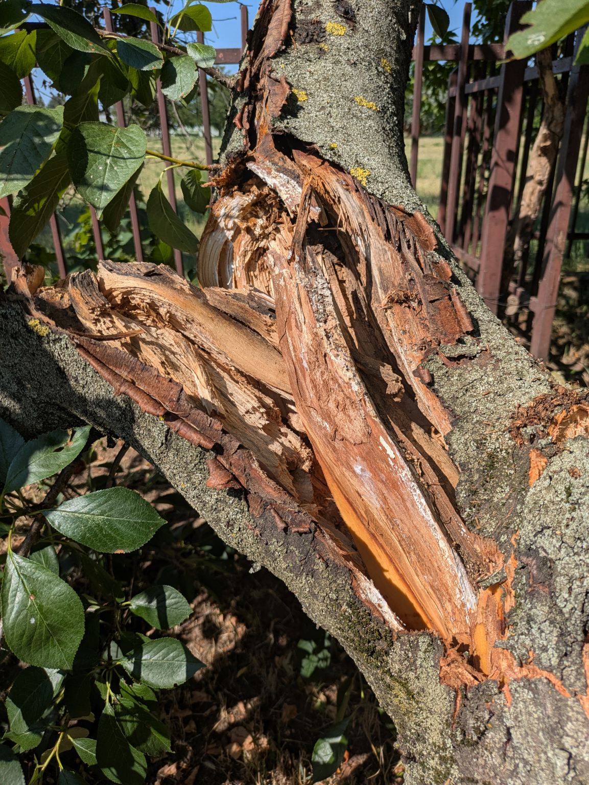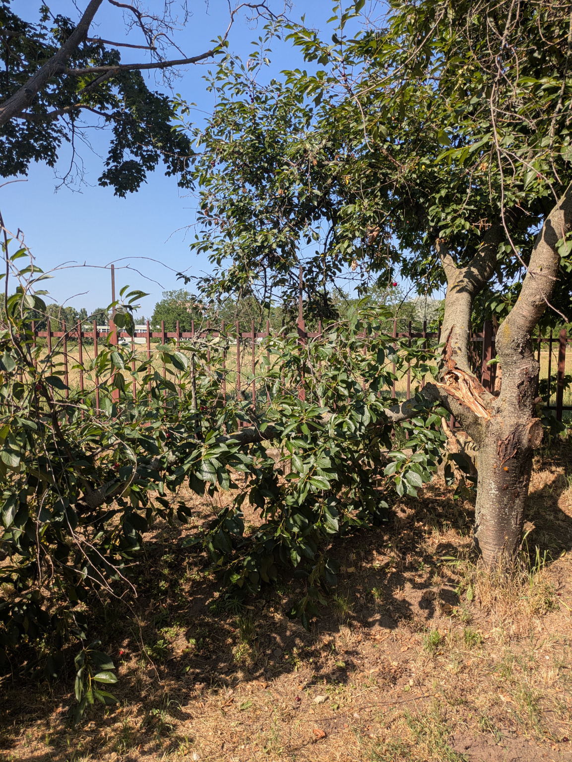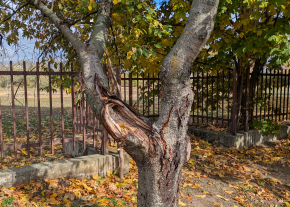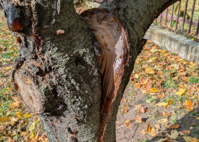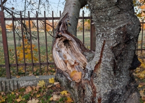 A Sarlósfecske utca 37. szám előtt, közterületen van egy sérült gyümölcsfa.