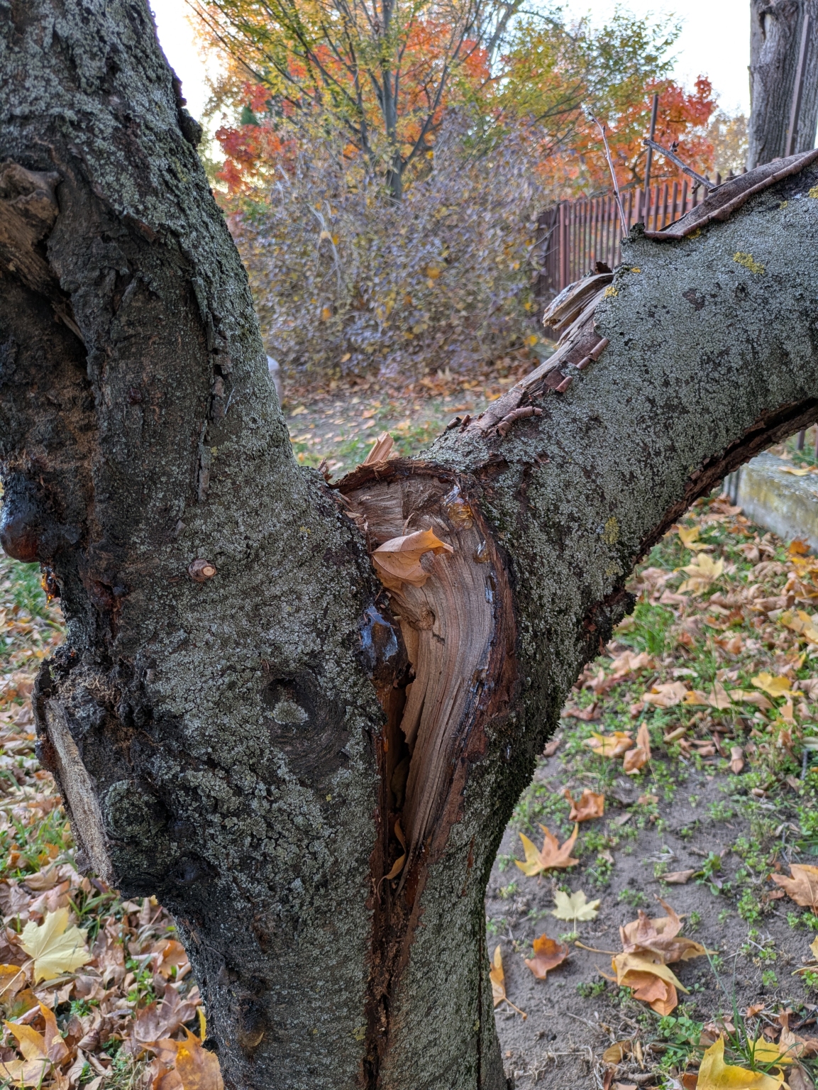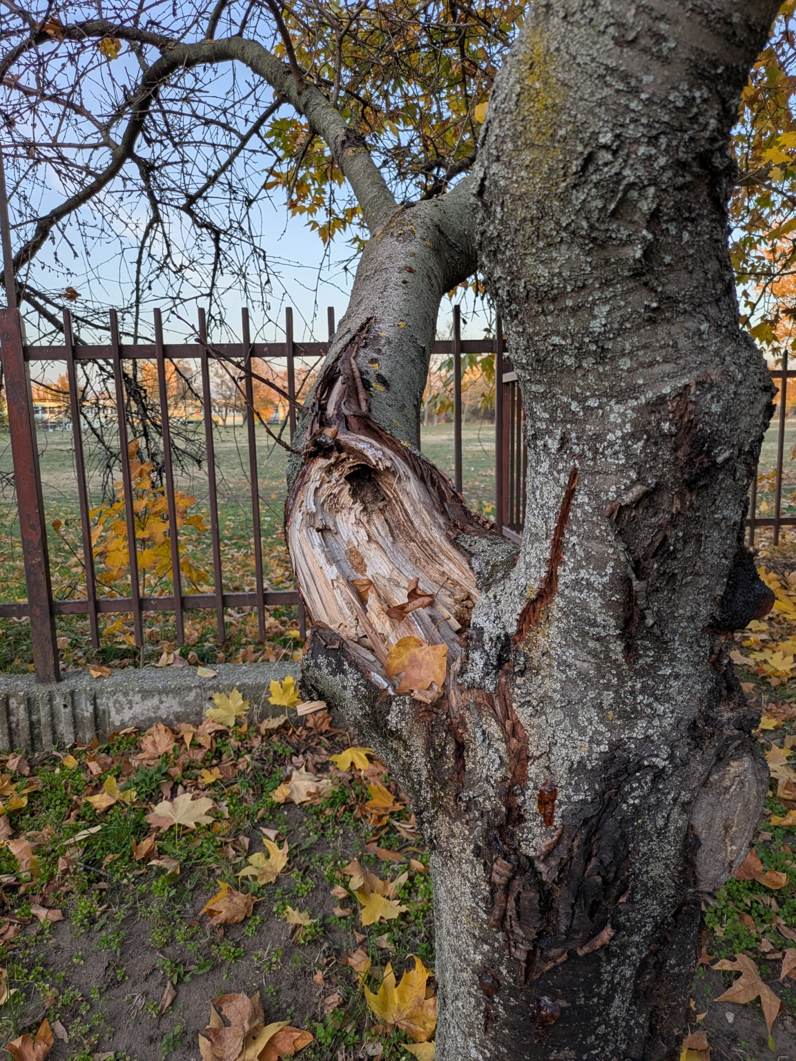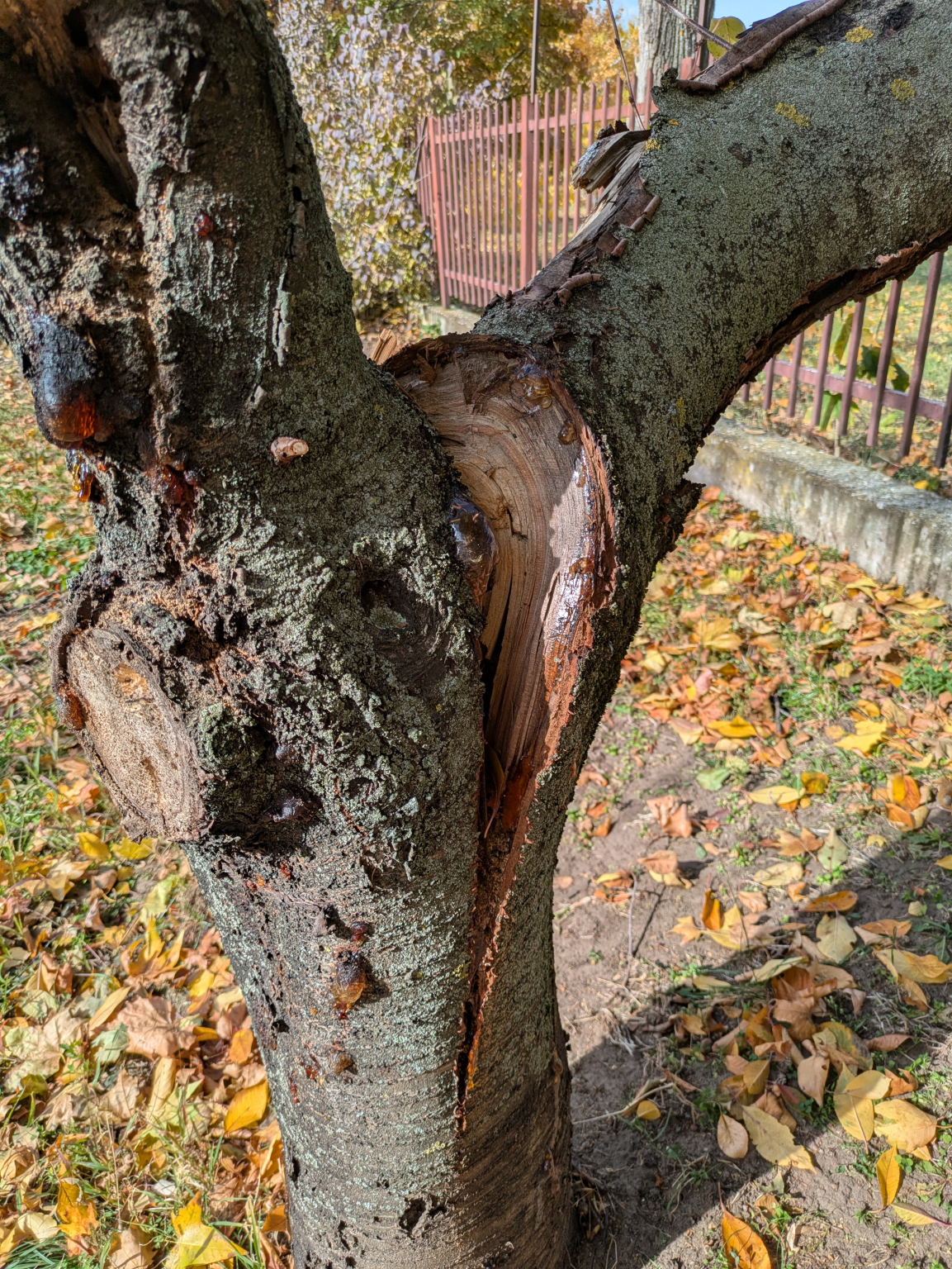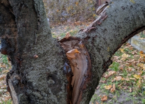 A Sarlósfecske utca 37. szám előtt, közterületen van egy sérült gyümölcsfa.