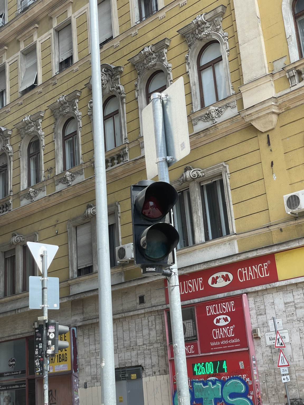 Gyalogosátkelő zöld lámpája nem világít egy 7. kerület Rákoczi úti zebránál. Koordináták: 47,49671° N, 19,06826° E