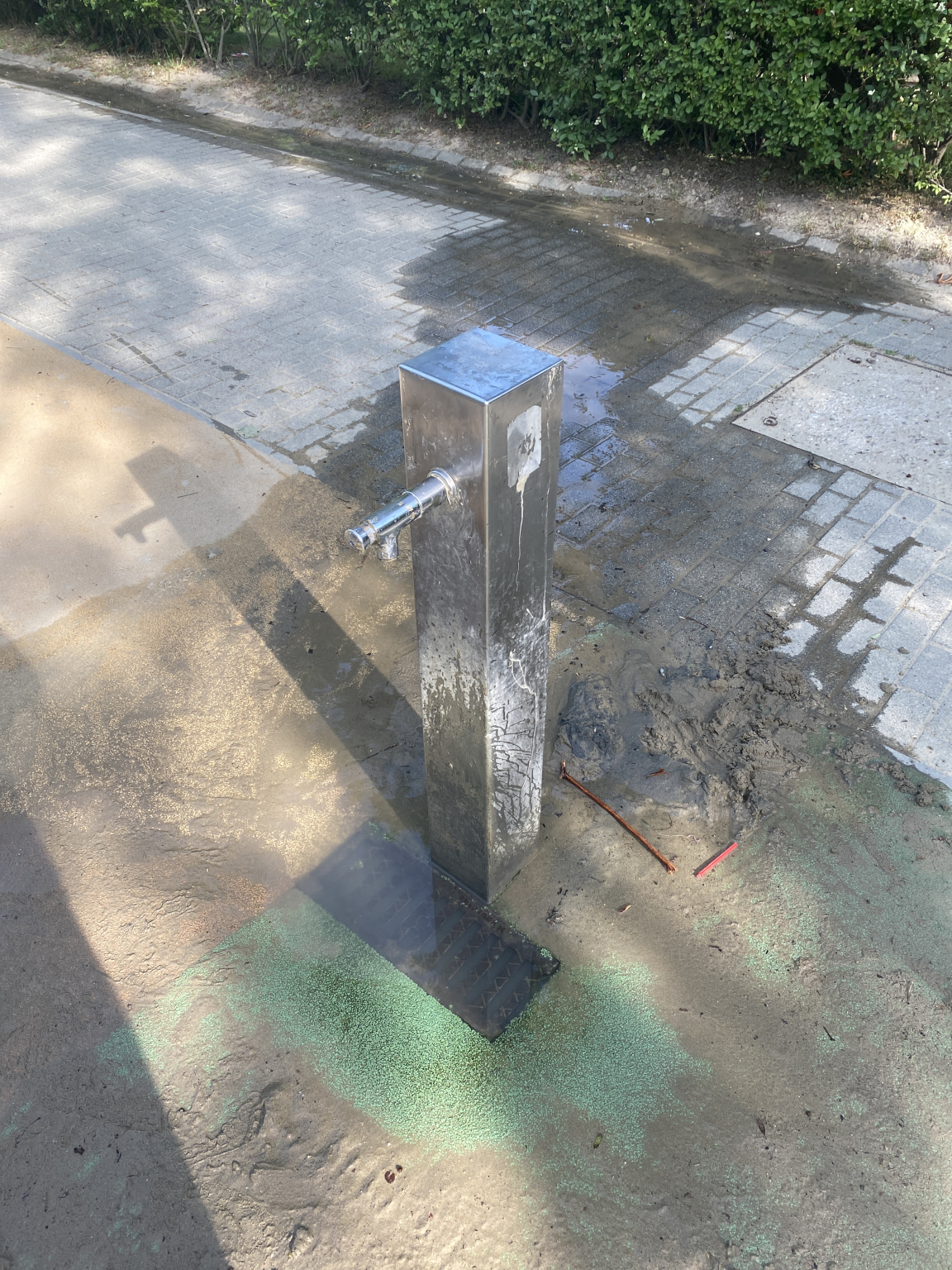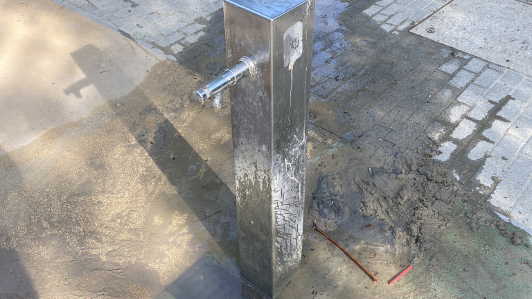 A játszótéren lévő kút lefolyója telement homokkal, ami dugulást okoz. Szabad kézzel nem megoldható a probléma.