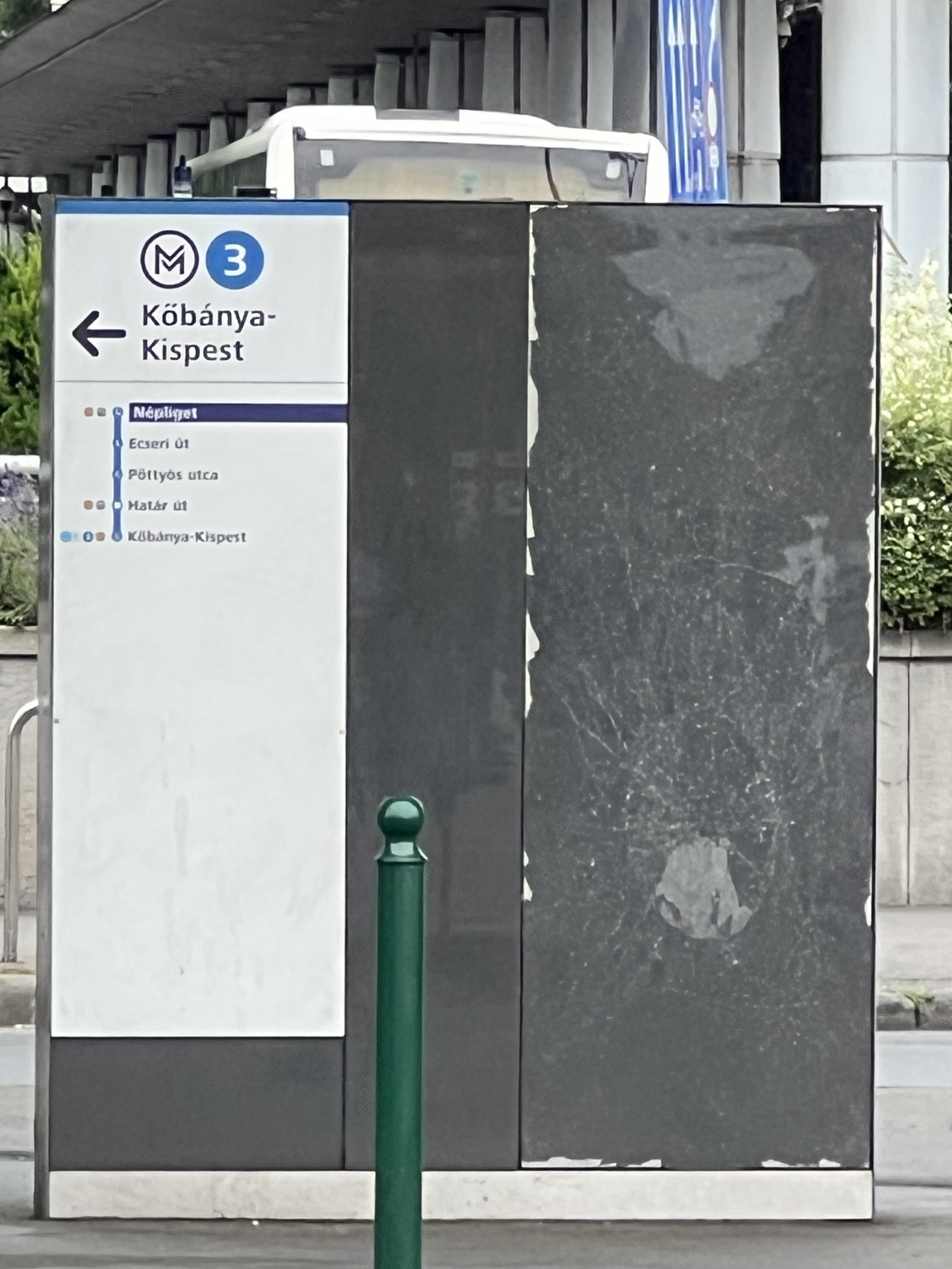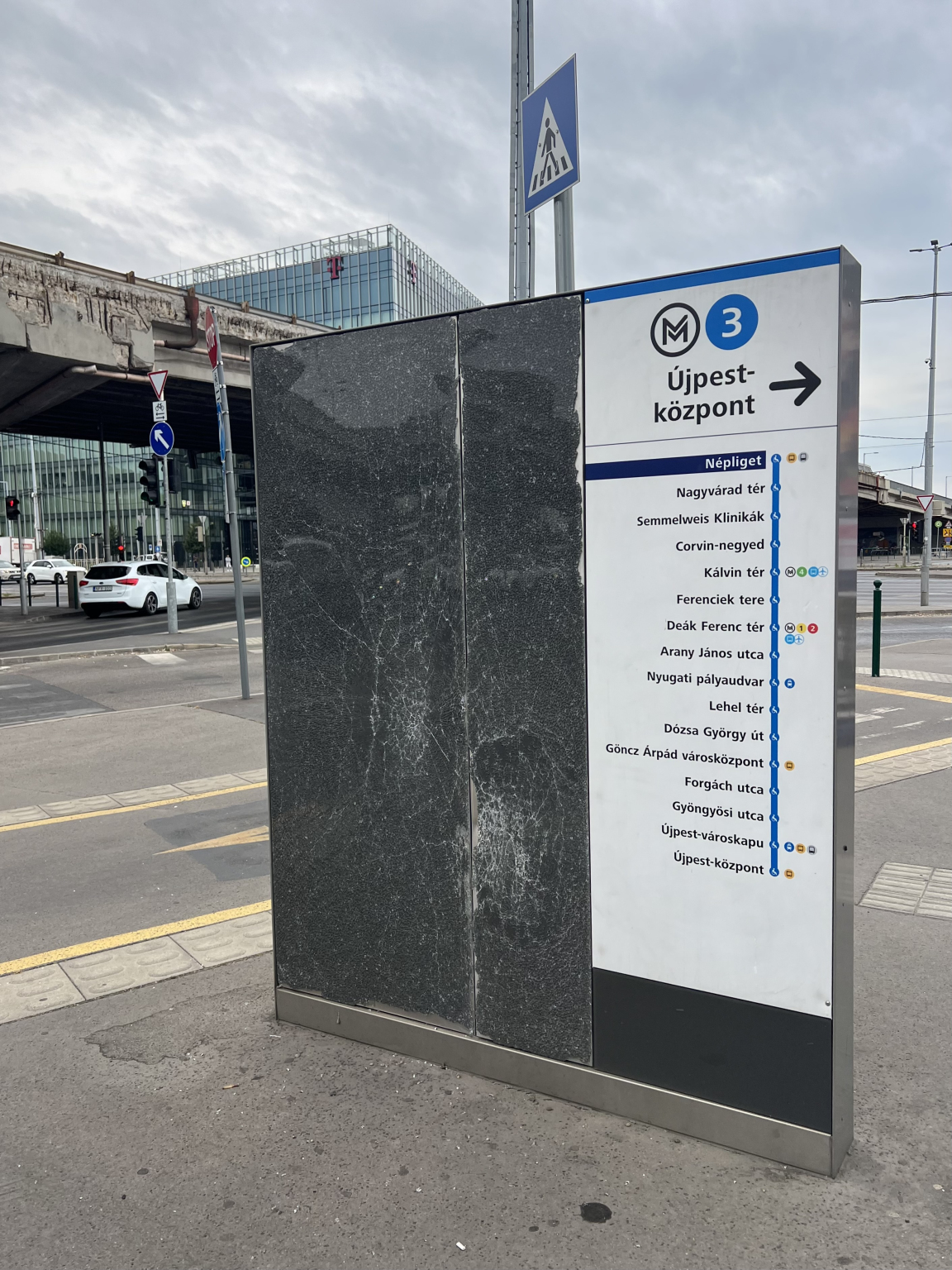 A Népliget metróállomás liftjei utcaszintjénél levő utastájékoztatási elemek díszüvegeit betörték, jelenleg balesetveszélyes, mivel folyamatosan esnek ki a darabjai, valamint éles a felülete. Kérem, hogy cseréljék ki az üvegtáblákat! Mindkettő oldal érintett.