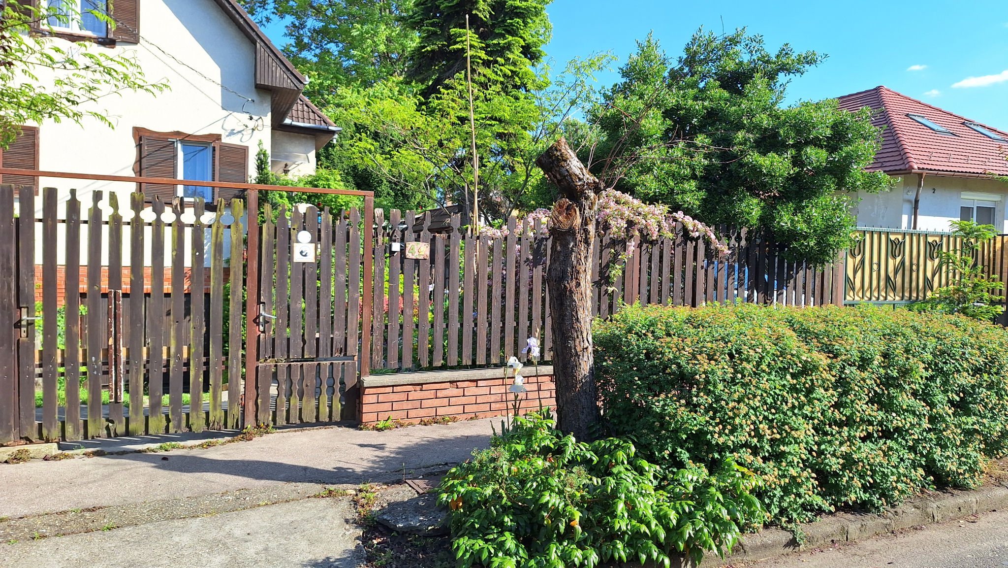 A Magyar utca 4. előtt áll egy kiszáradt fatörzs.
