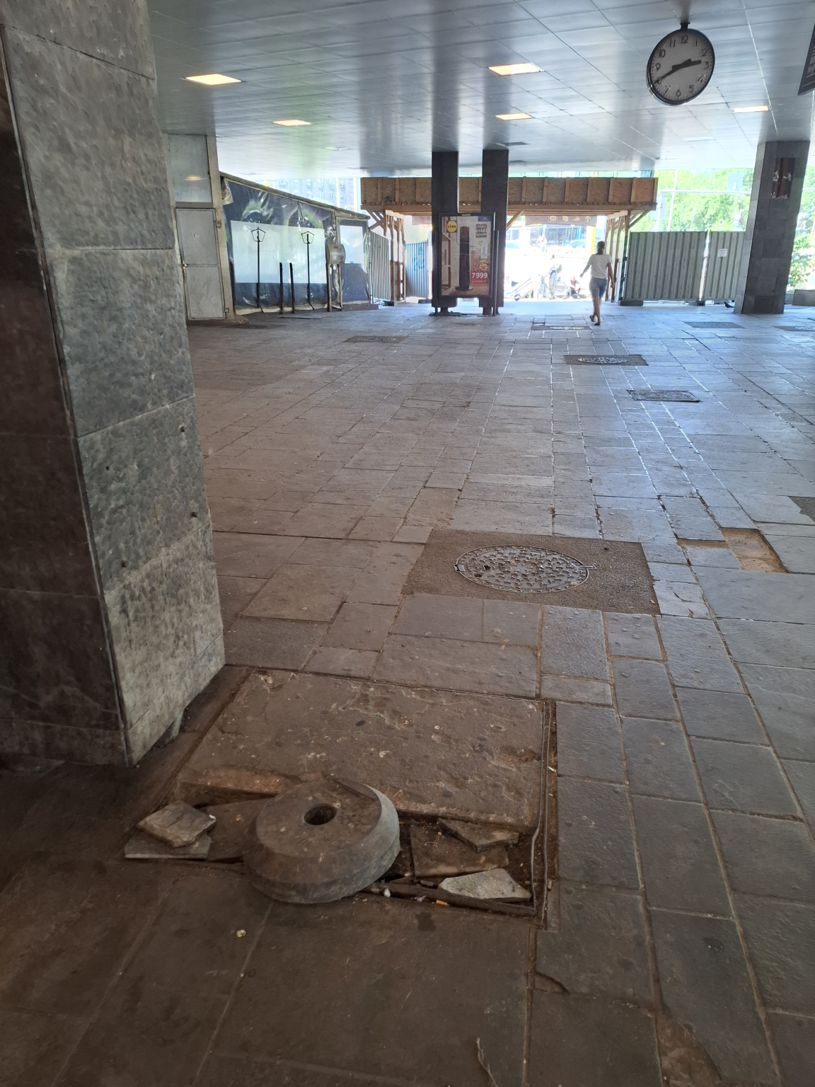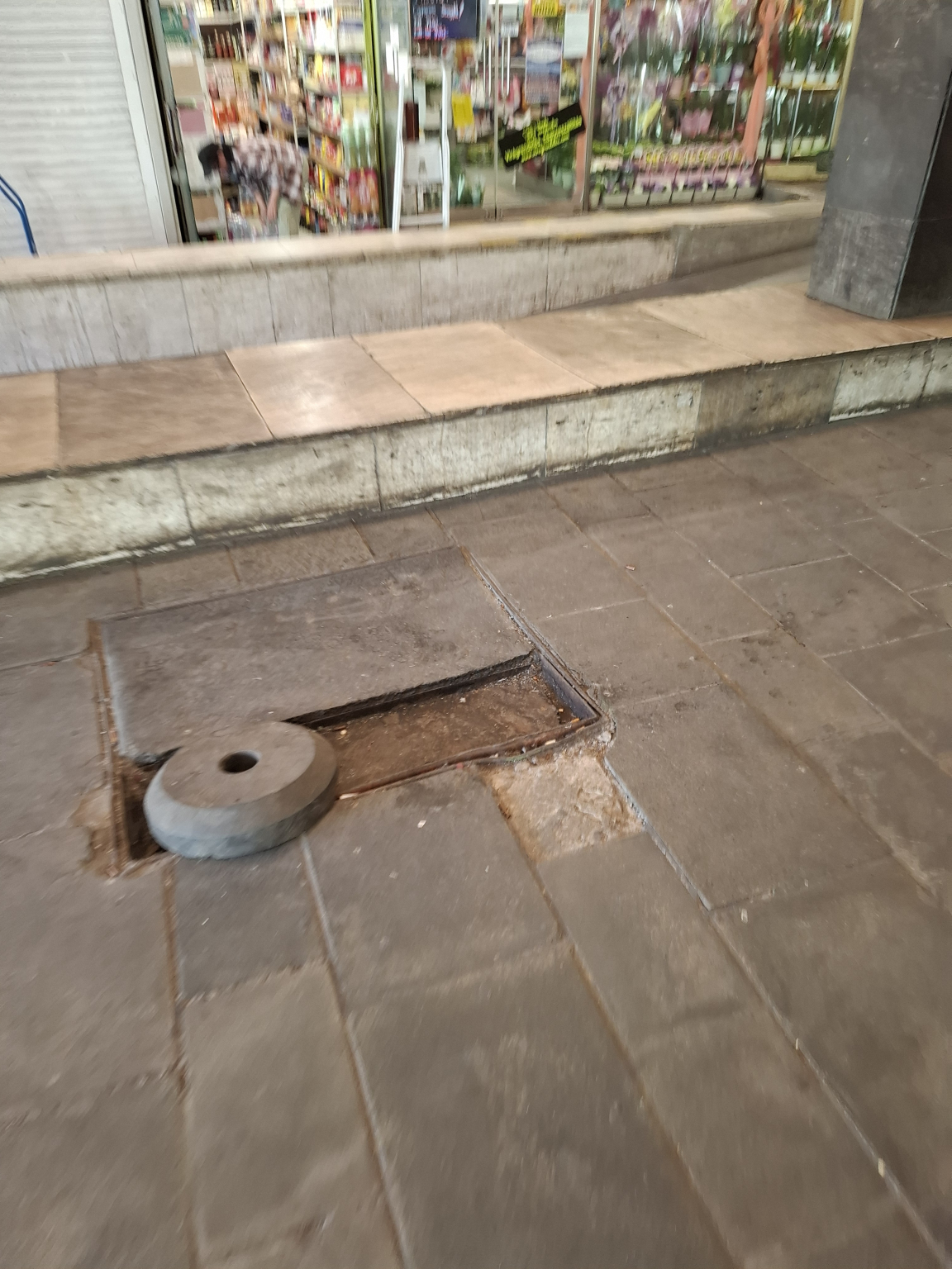A Dŵli palyaudvaron az üzletsor előtti részen több aknafedél.is rendkívül balesetveszèlyes.