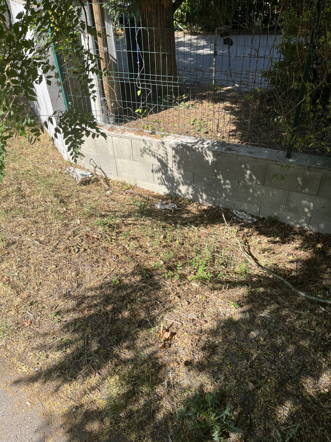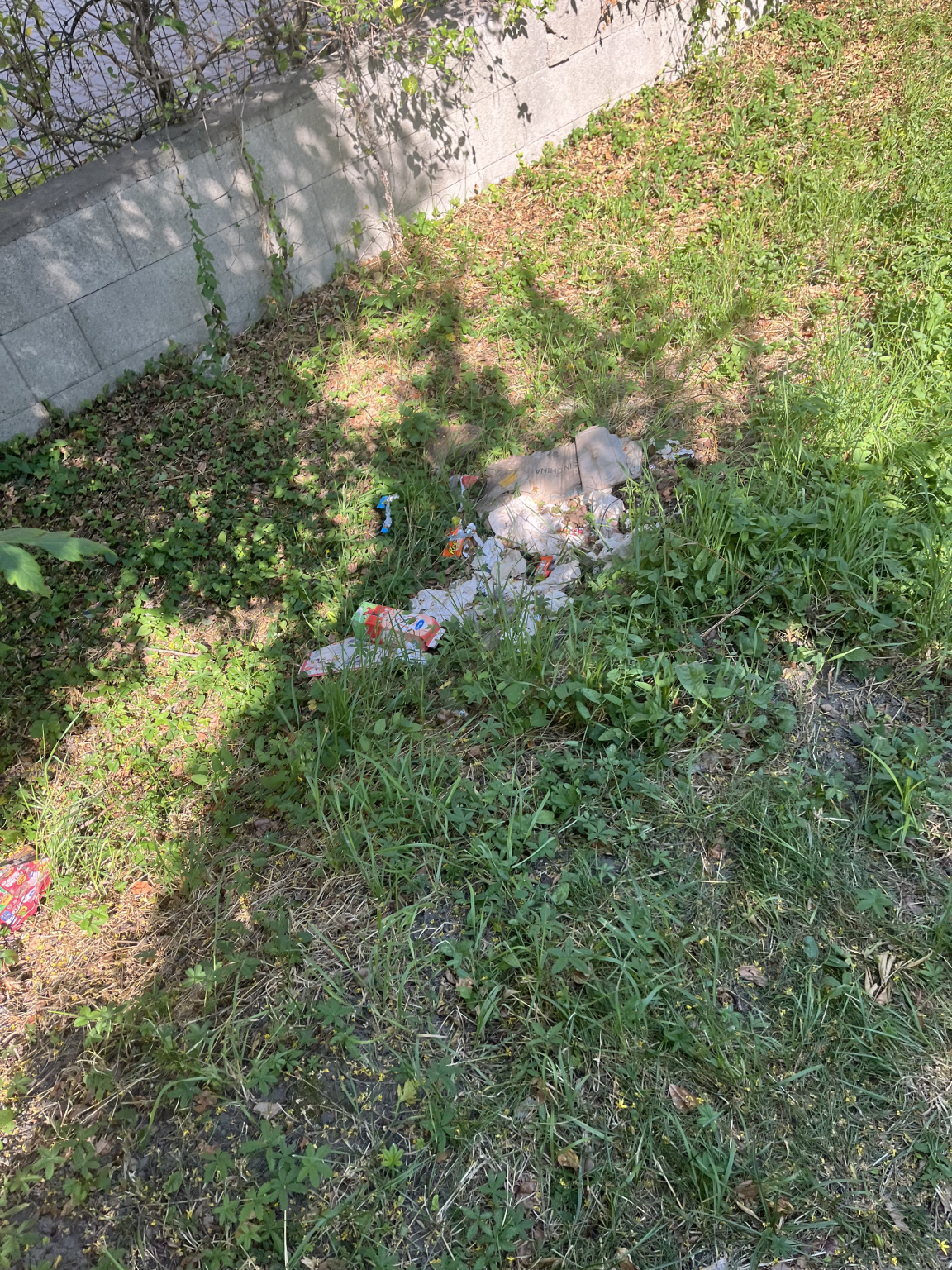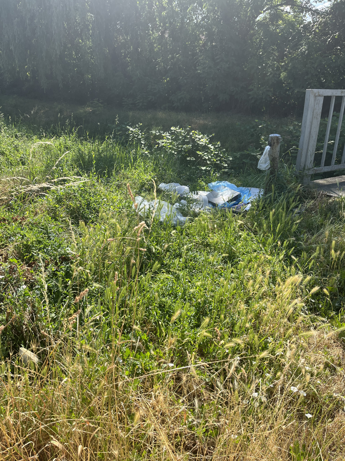 Szétdobált szemét a patak mellett, híd mellett és sétány mellett is.