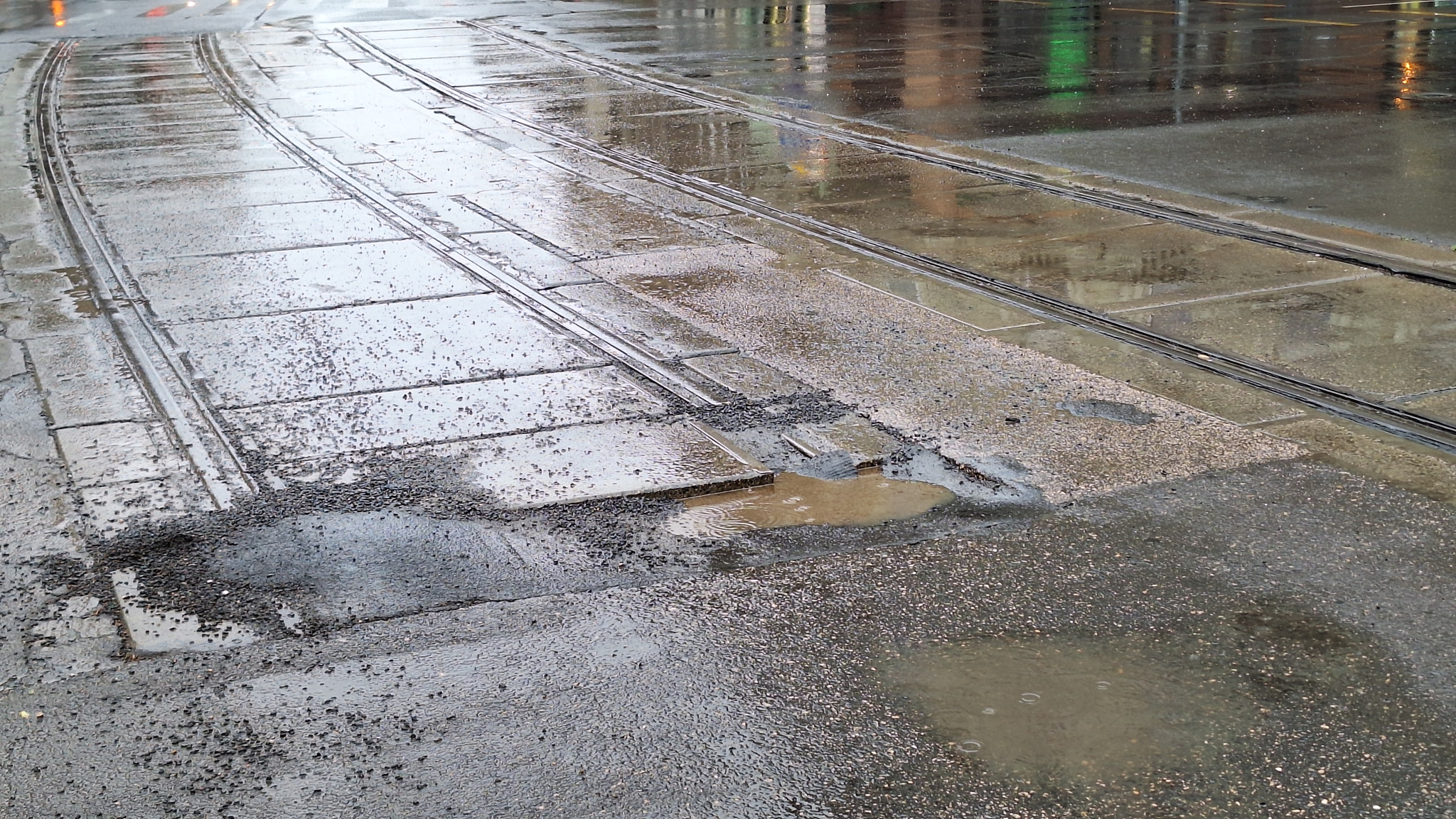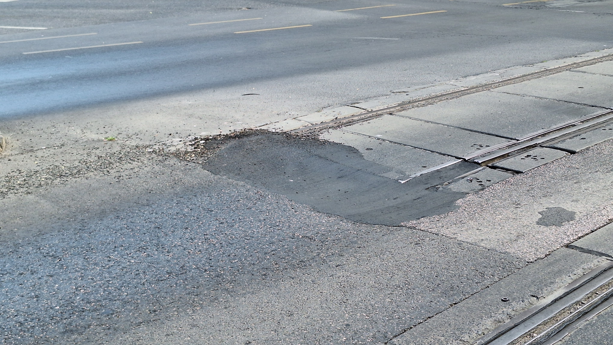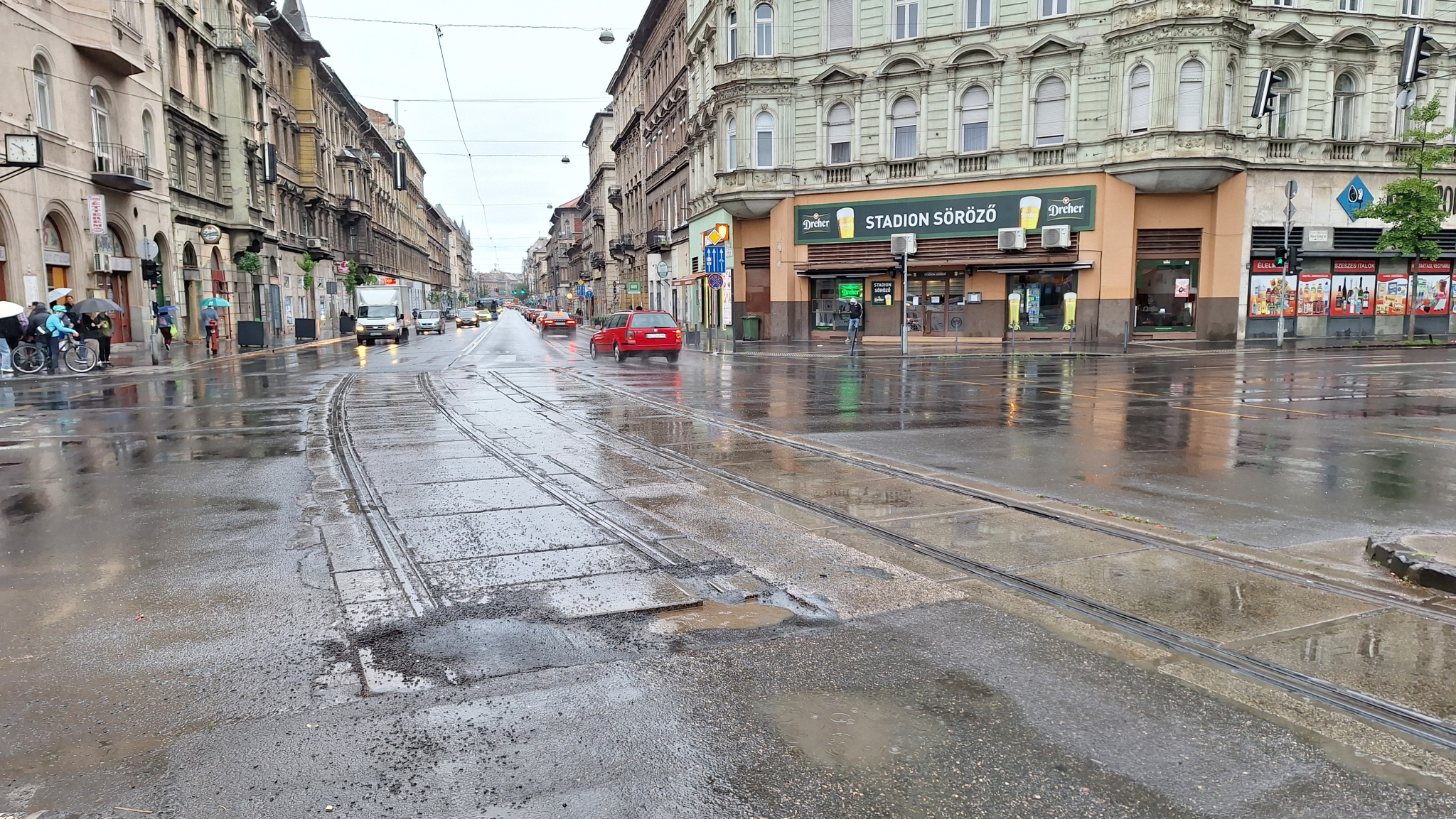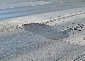 A Thököly és a Dózsa György út kereszteződésében az egykori vágányoknál van egy nagy kátyú.
