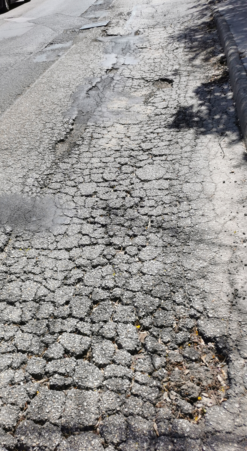 Az úttest erősen megsüllyedt, néhol kátyús (csak az utóbbit próbálják javítani néha, de alig segít már a helyzeten). Plusz probléma, hogy a buszok tempósan belehajtva idegesítően hangosan "pattognak" és zörögnek.