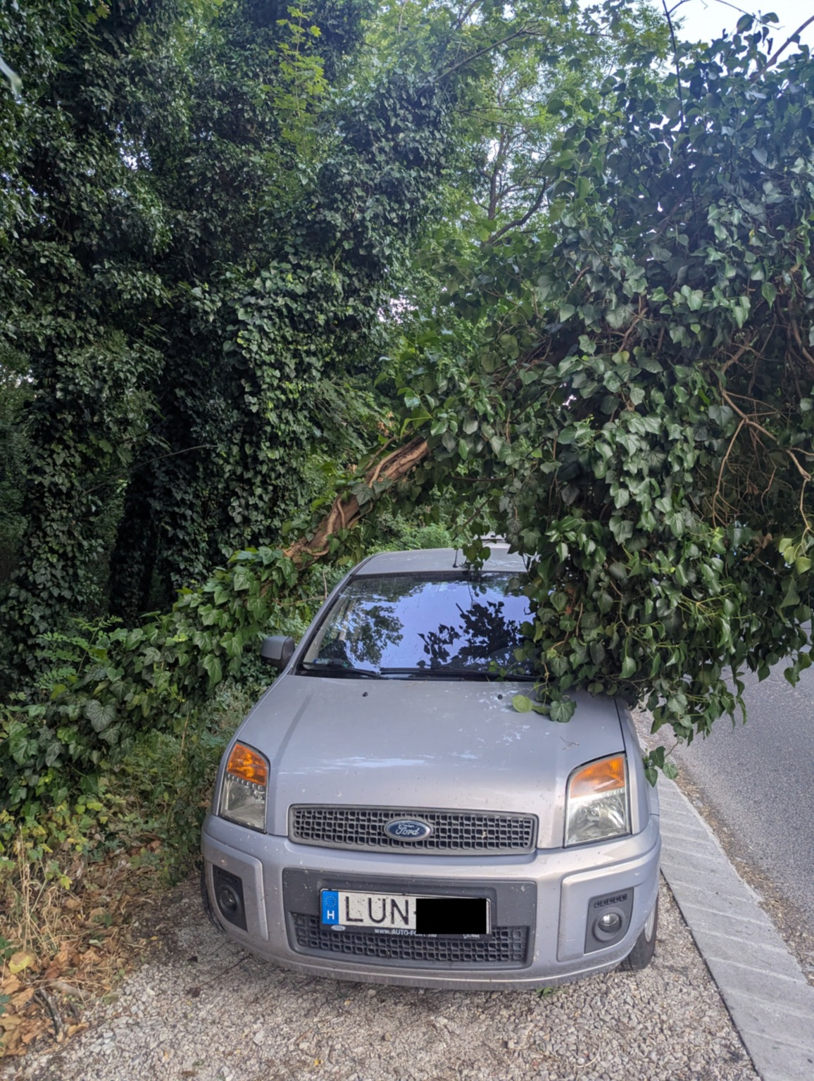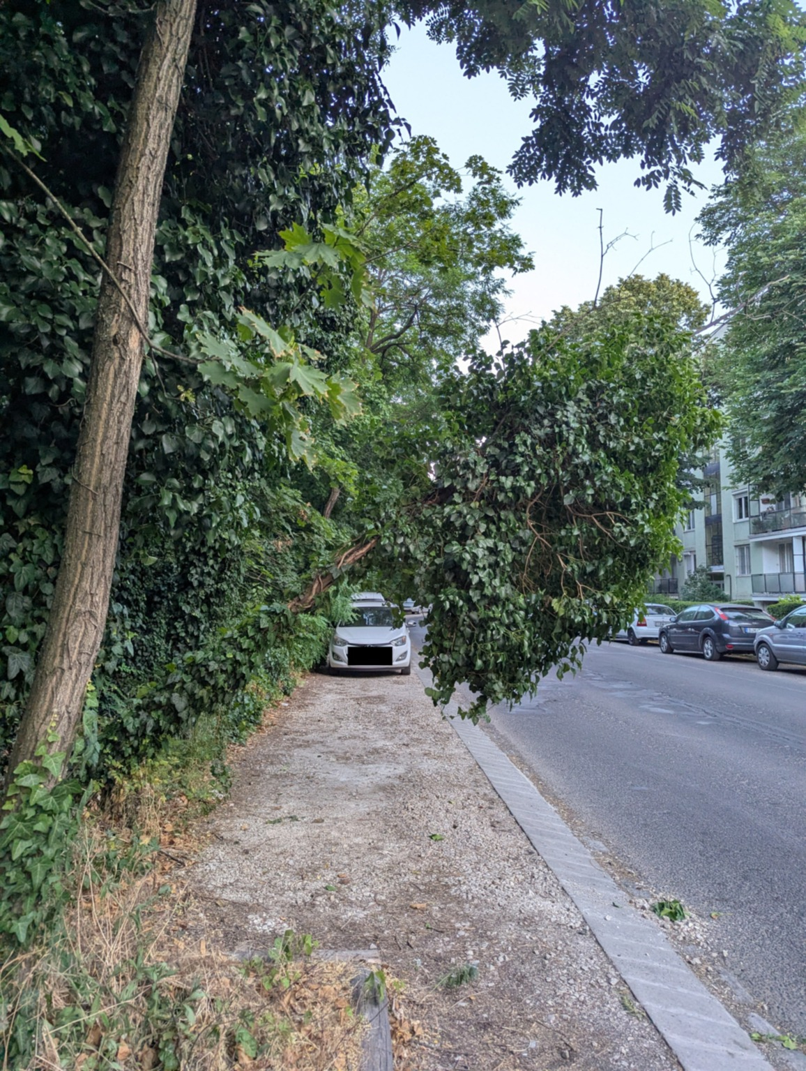 Az erdő melletti kiépített parkoló sávra épp rádőlni készül egy kiszáradt, borostyánnal benőtt fa. (1098, Távíró utca 13. 3. lph.)