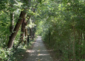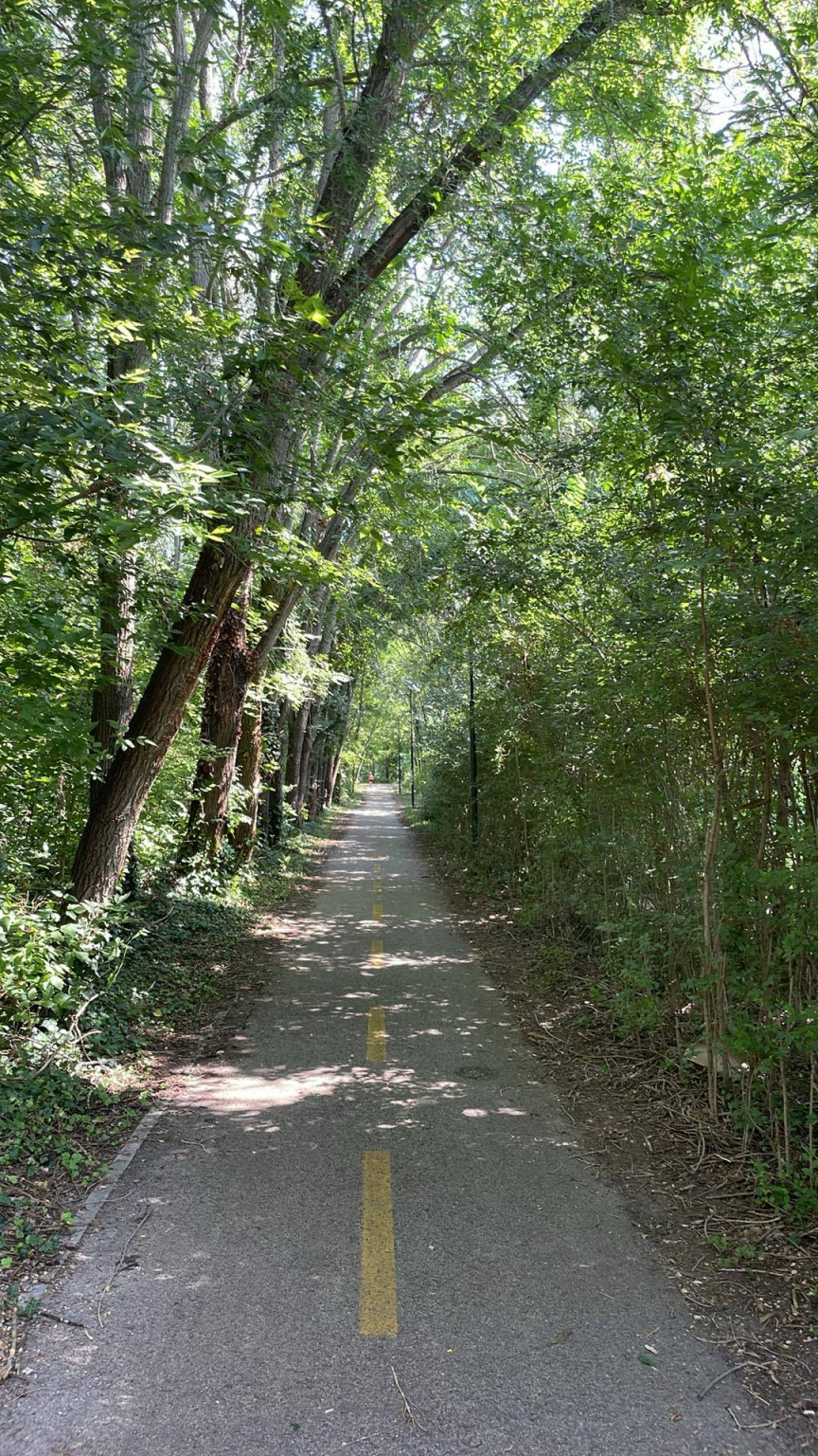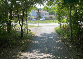 Fás szakaszon lévő kerékpárútra mindkét oldalról ránőttek a növények: faágak, bokrok, aljnövényzet. A két sávból sokszor csak egy használható.