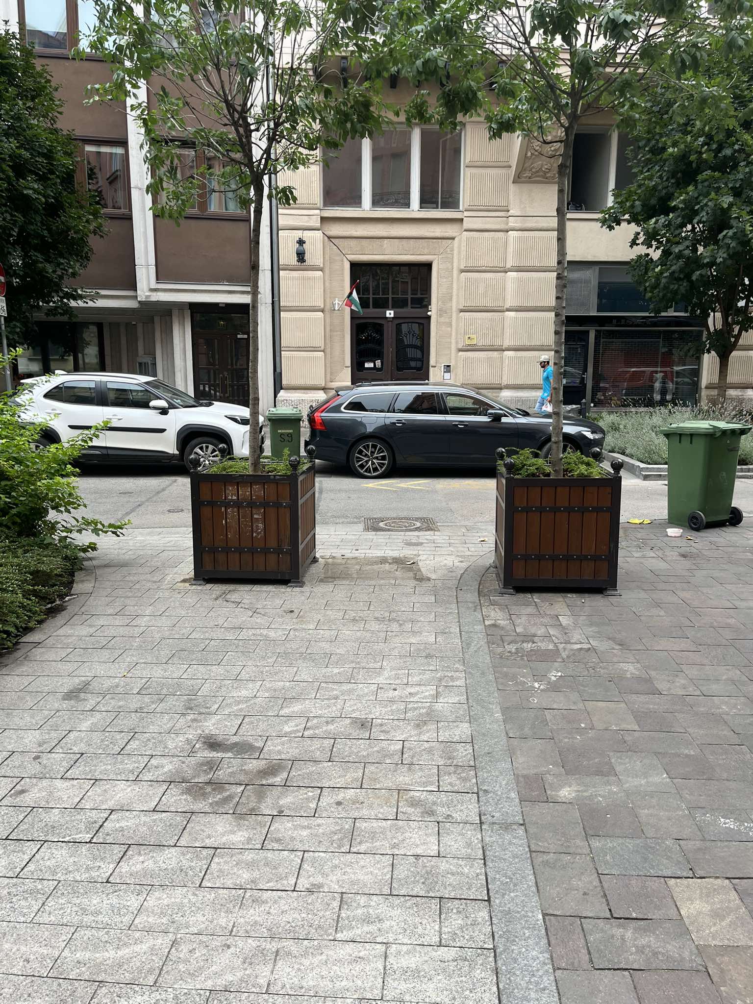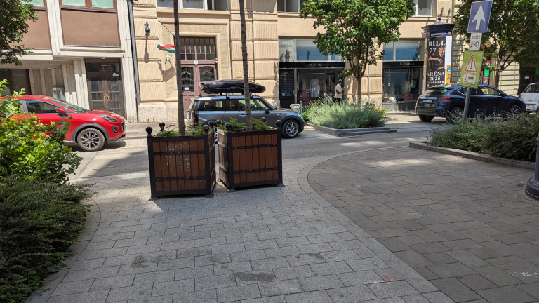 Kérem, legyenek szívesek az egyik planténert áttenni a járdára, hogy a Vármegye utca torkolatát ne zárja el teljesen, mert így sem kerékpárral, sem babakocsival, hovatovább kerekesszékkel sem használható a rámpa.