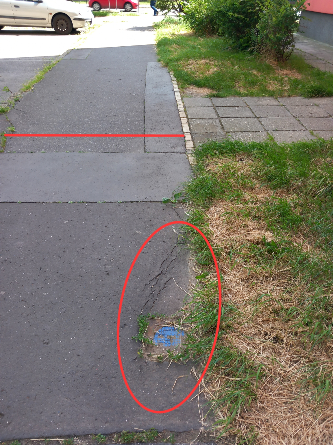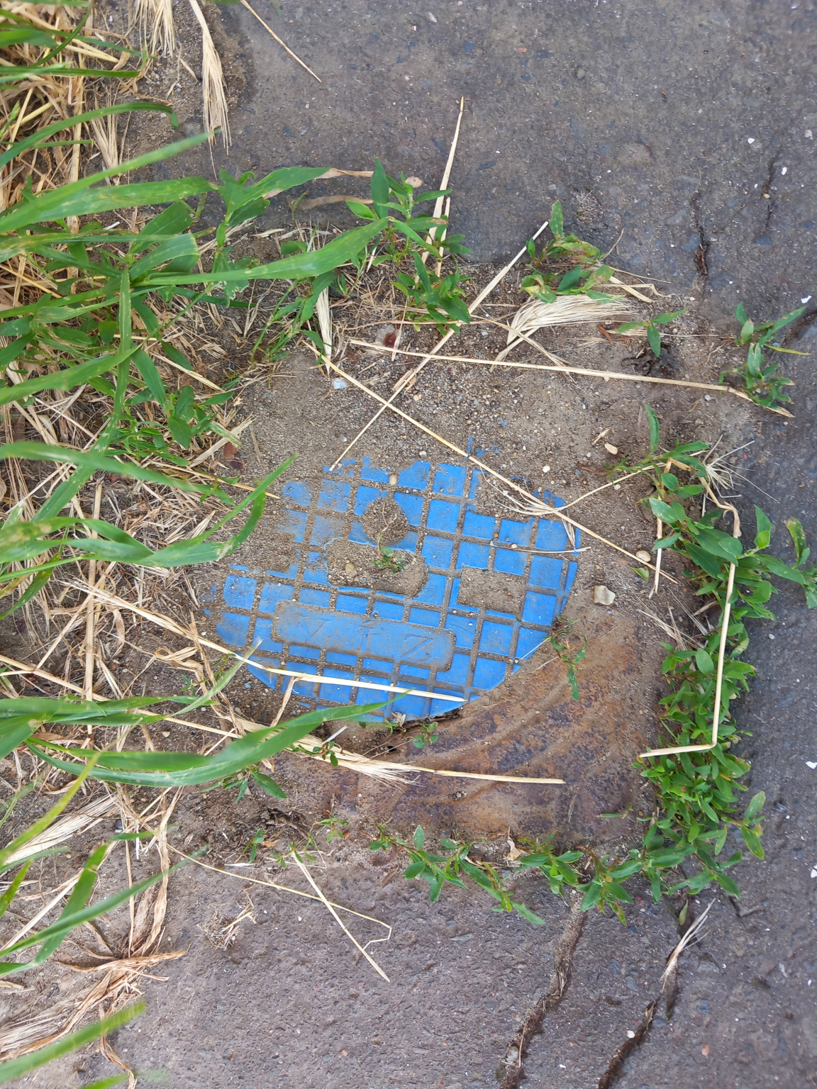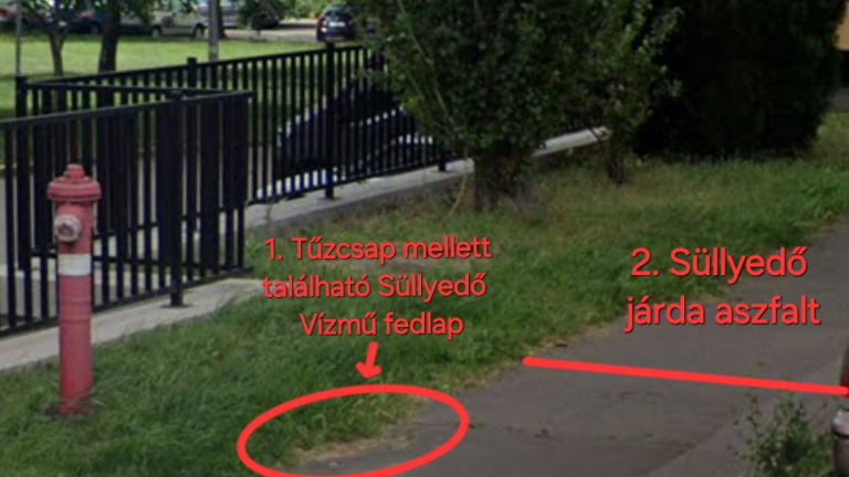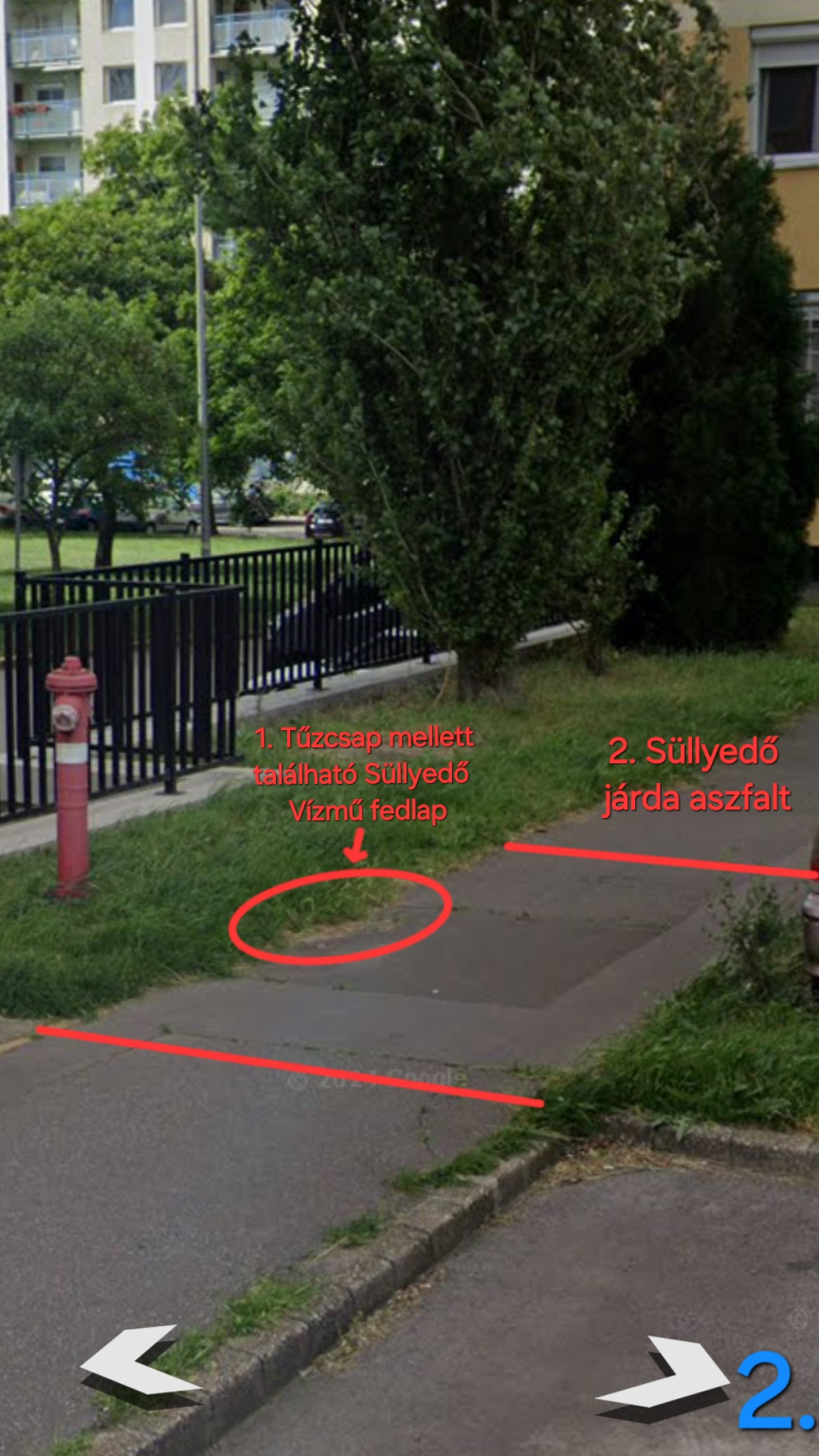 A Szőlővirág utcai 12 es ház mögött Szőlővirág utcai felé parkoló járdán közvetlenül, tűzcsap mellett a vízmű fedlap a járda aszfaltall együtt lassan be süllyed