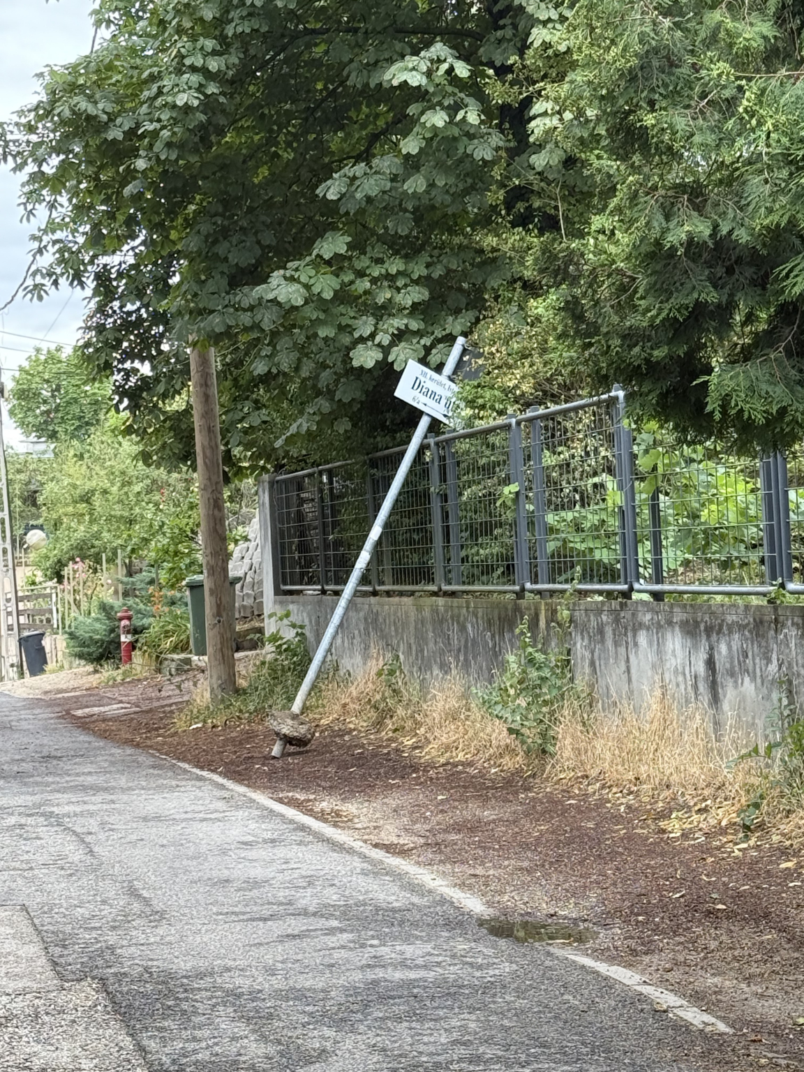A Diana utca és a Gyöngyvirág utca sarkánvalaki kidöntötte az utcatáblát. Nem lett helyreállítva, valaki arrébb vitte es egy kerítésnek támasztotta.