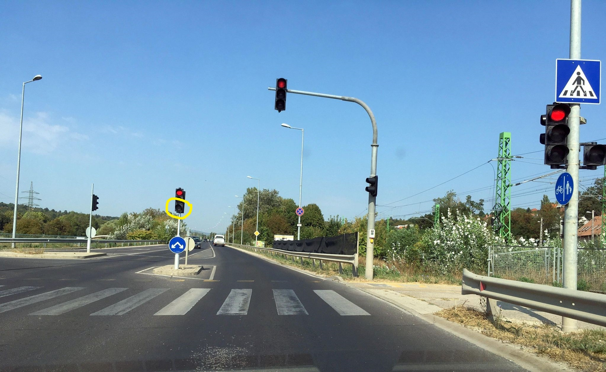 A képen bekarikázott lámpa zöld jelzője felől hiányzik a fényterelő. A jelölő van pontosan elhelyezve, a Bécsi úton található.