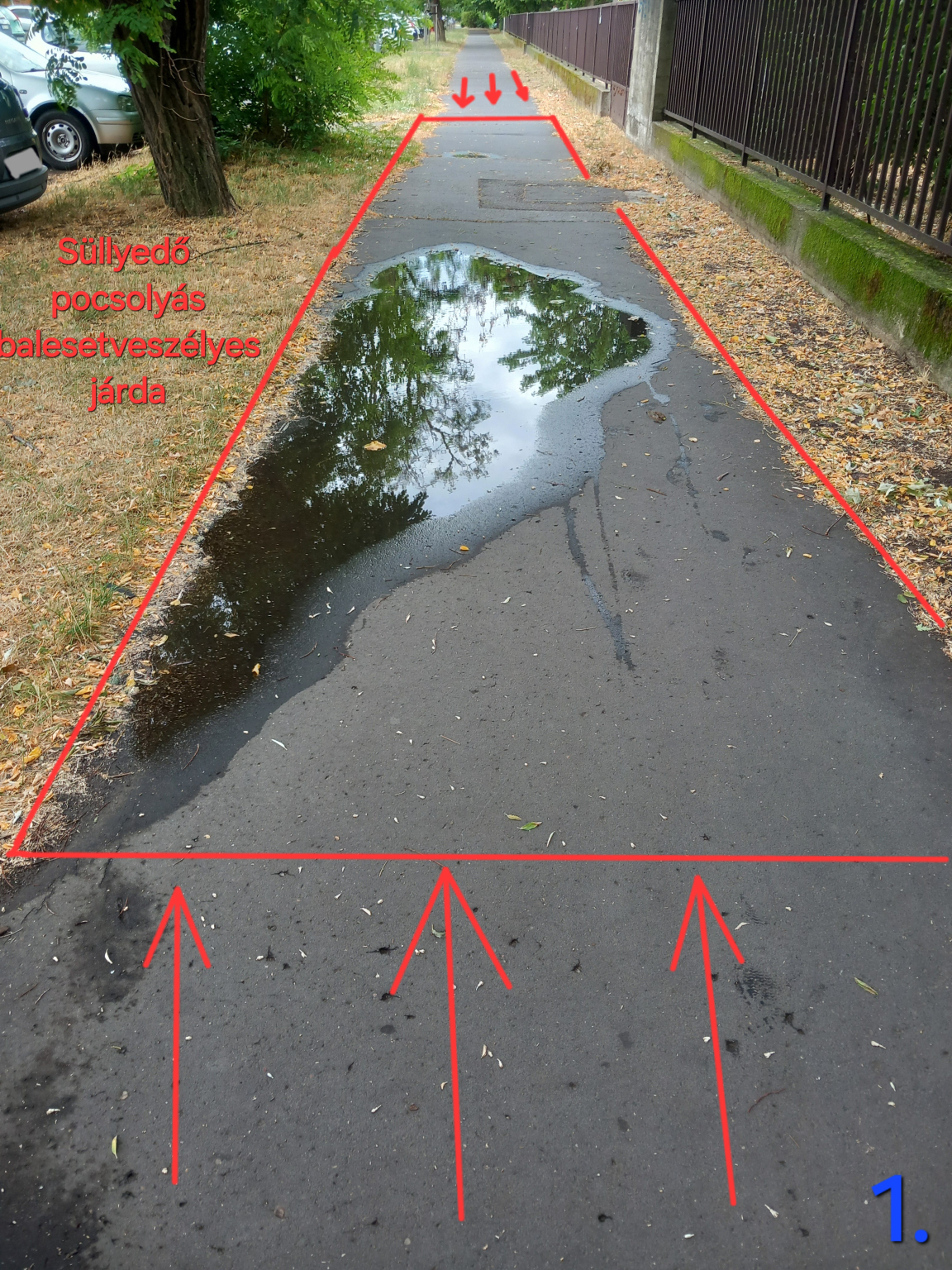 Értesítem hogy Gergely utca 87 és Gyömrői út 99 között az idősek otthona mellett kerítésen kívűl, továbbra is a járdán süllyedés pocsolyás nyom van köztük bármikor be süllyed a járdának az aszfaltburkolata, járda szakaszán olyan mennyiségben van ezen a járdának burkolata hogy lassan járhatatlan, az idősek, babakocsisok, gyerekek és felnőttek alig tudják ki kerülni a balesetveszélyes járdát és akár mértékben életveszélyessé válhat.