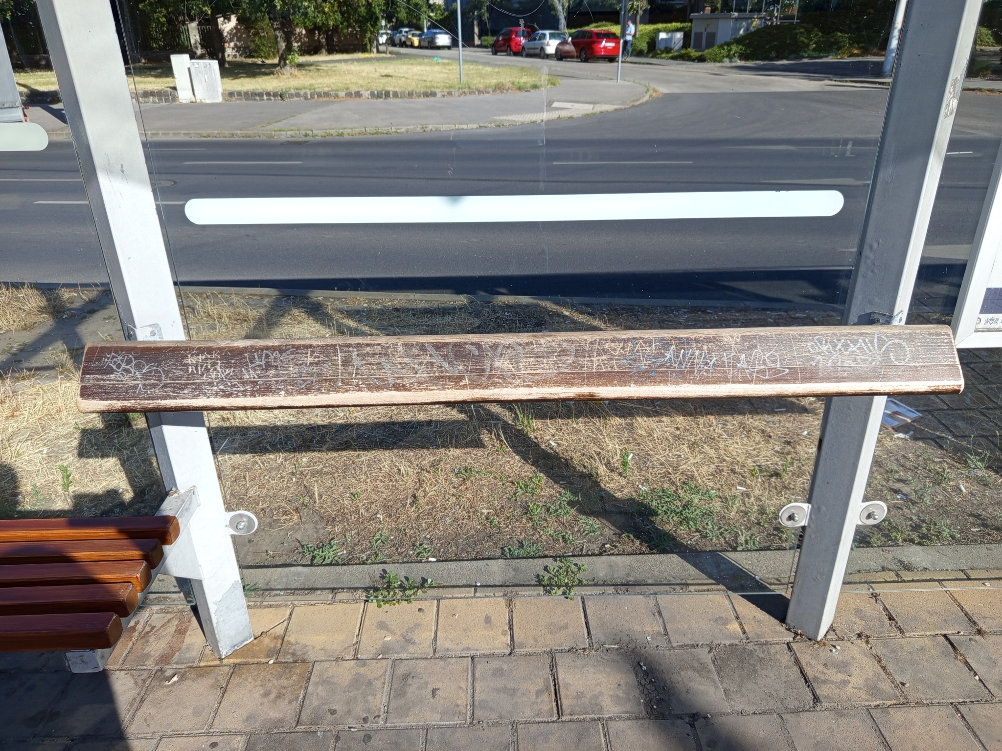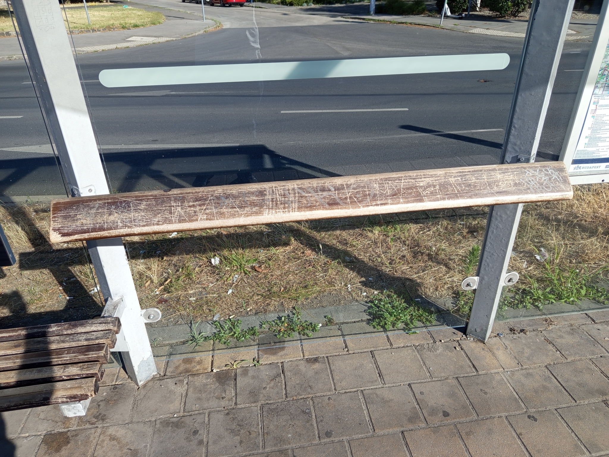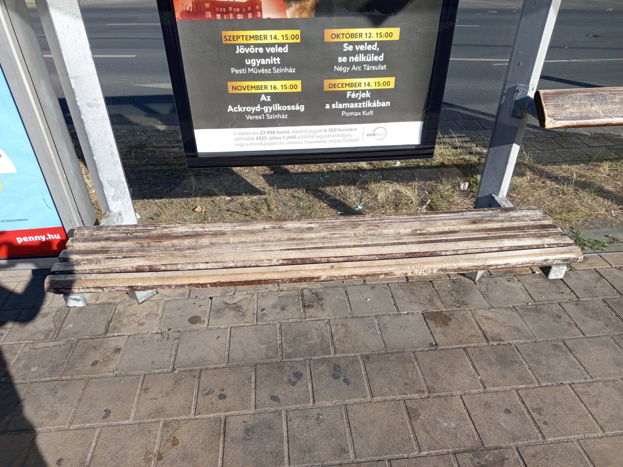 Egy darab nagyon megkopott pad és kettő darab támaszkodó! Megkérném az illetékest hogy gondoskodjon a probléma megoldásáról! Előre is köszönöm!