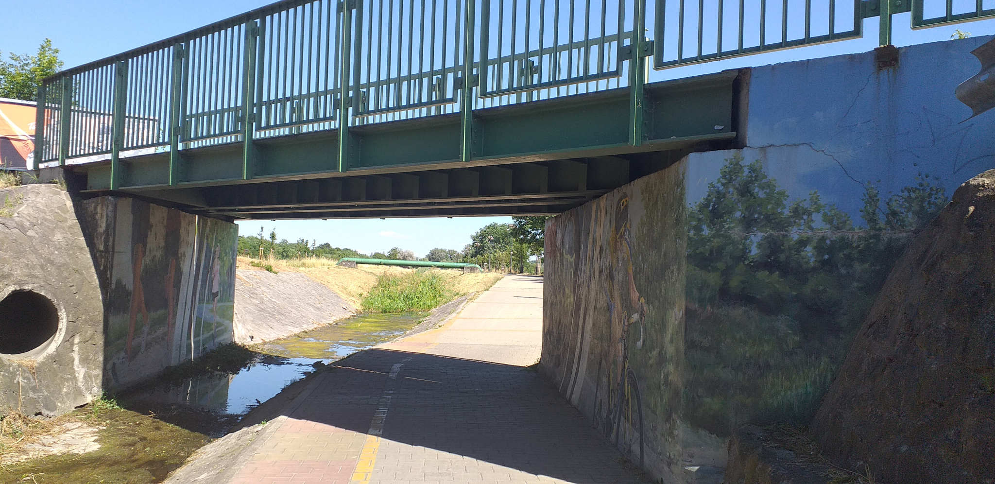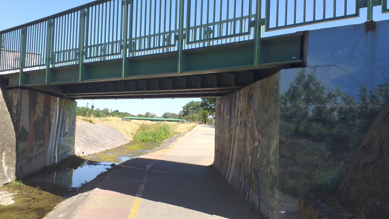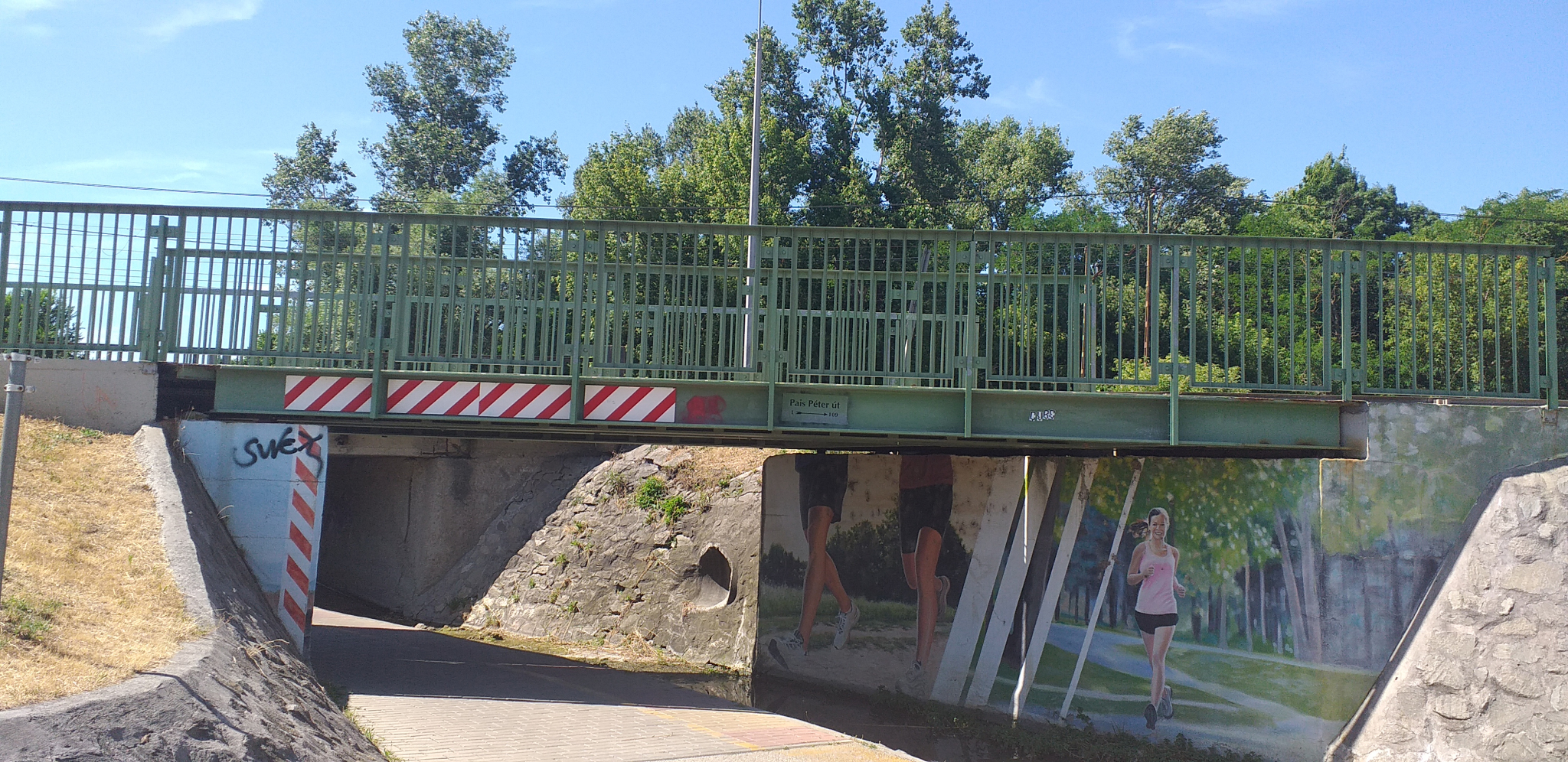 A XVI. ker. Veres Péter út – Szilas patak menti kerékpárút keresztezésénél a híd alatt átvezető kerékpáros infrastruktúr...