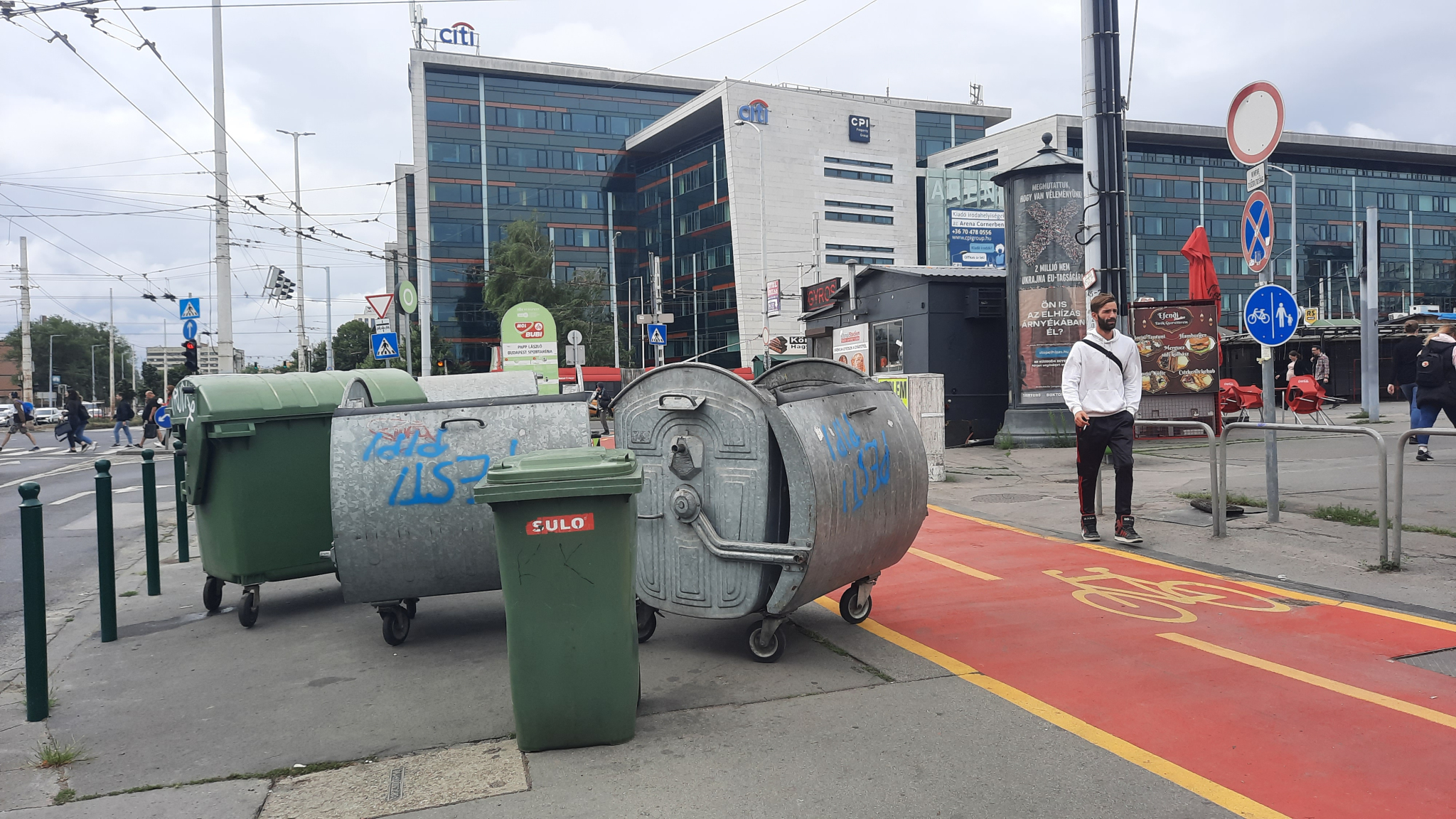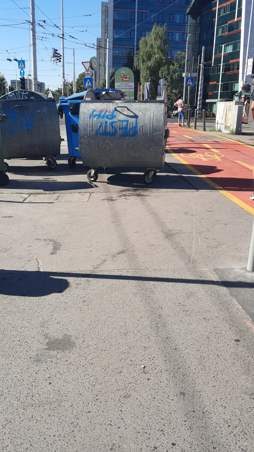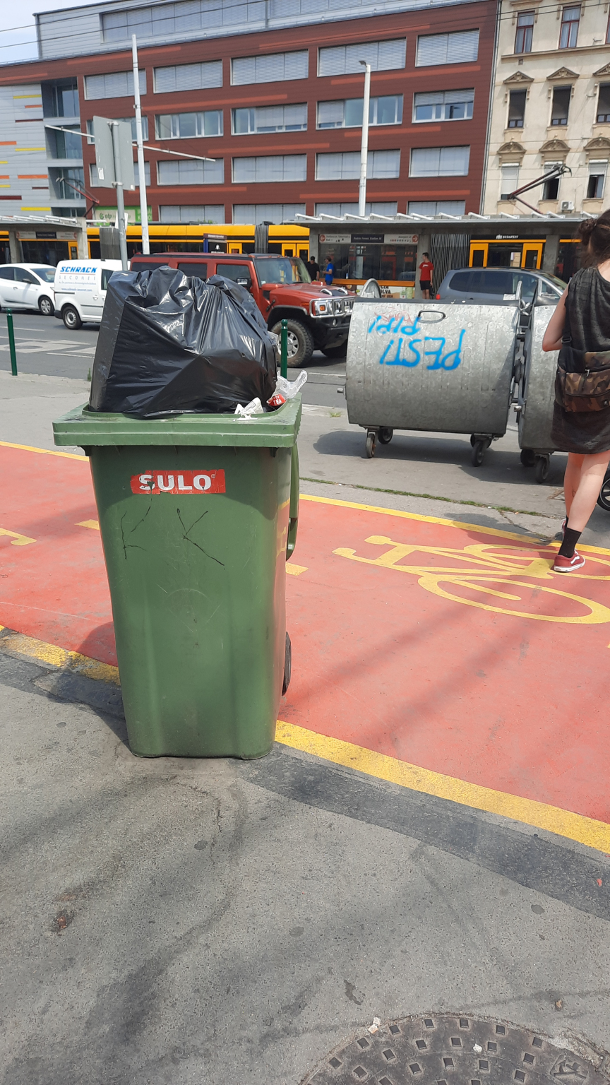 Kommunális hulladéktároló konténerek (6 db) nem megfelelő elhelyzése, használata ellehetetlenítve a gyalogos közlekedést, valamint akadályozza a biciklitároló hozzáférését is, (sajnos ez mindennapos) nem utolsó sorban a kukákból folyik ki az újonnan felújított bicikli sávra és a járdára is a rothadó lé, ami rettentő büdös. Egész nap így néz ki a stadion metrómegálló bejárata előtti terület (Hungária körút trolimegálló)