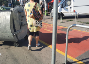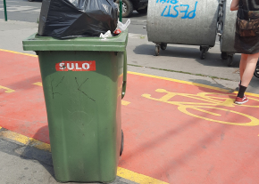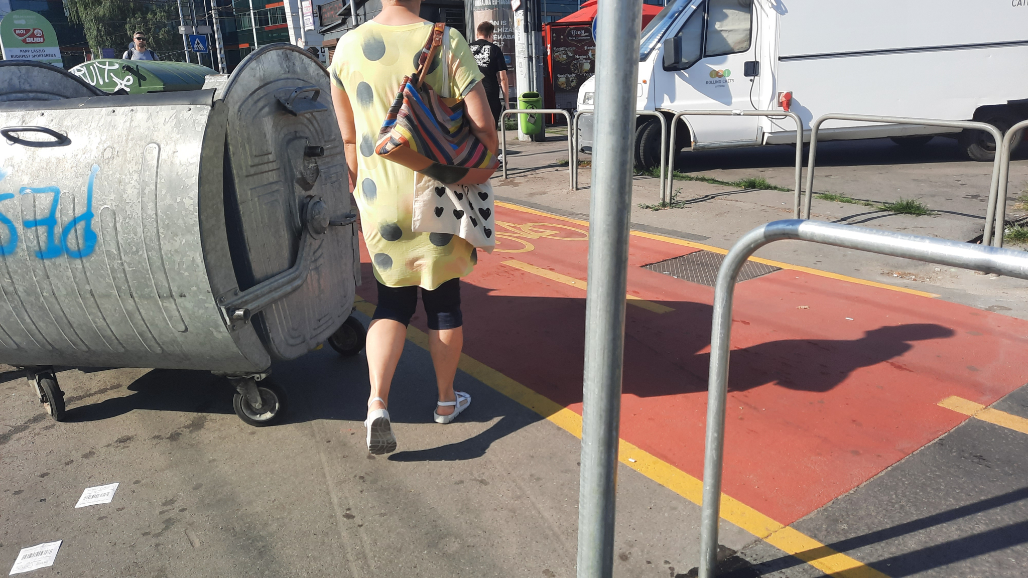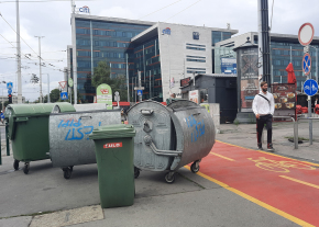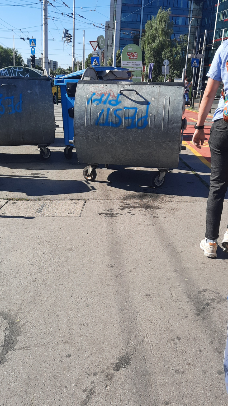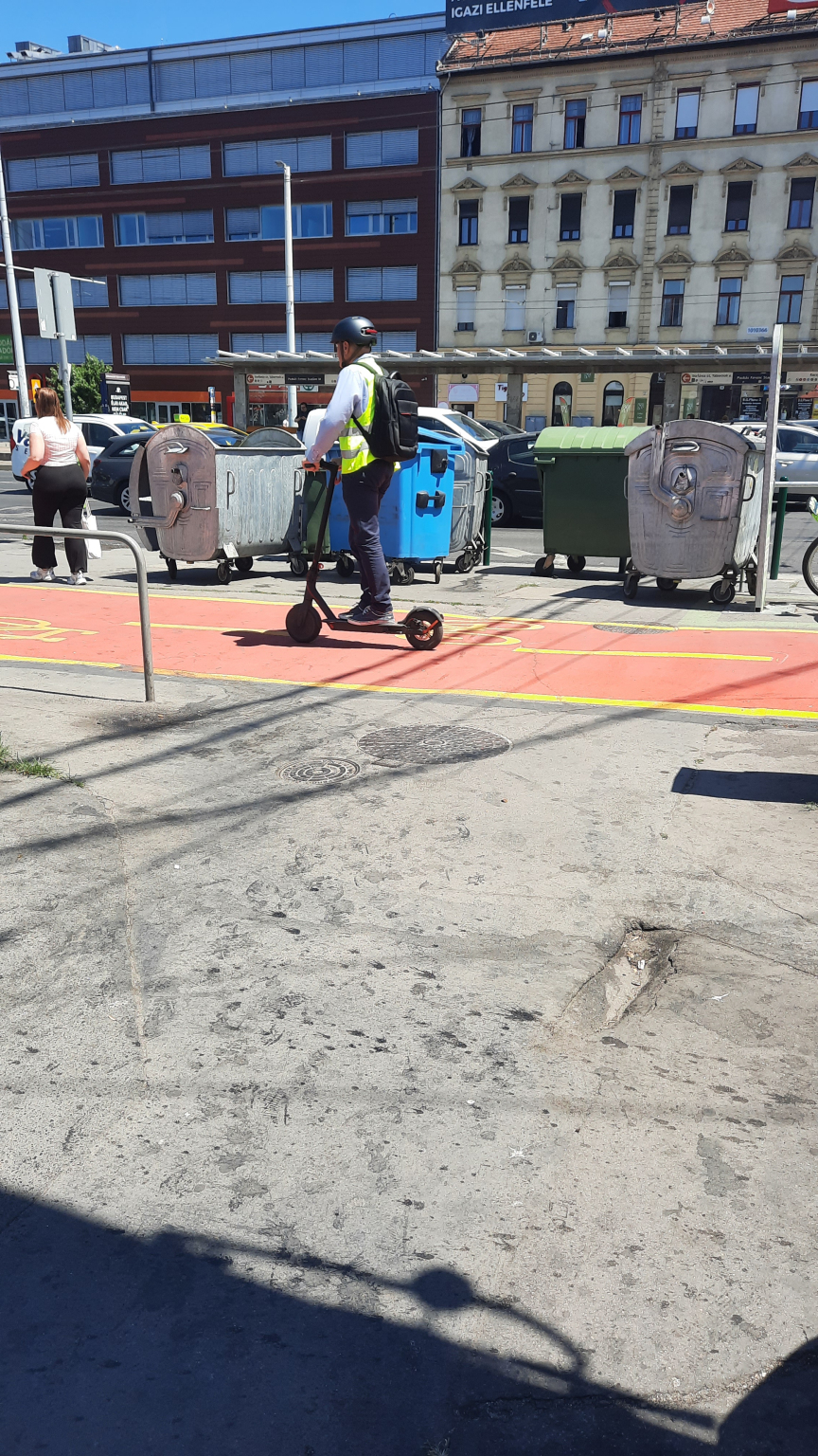 Kommunális hulladéktároló konténerek (6 db) nem megfelelő elhelyzése, használata ellehetetlenítve a gyalogos közlekedést, valamint akadályozza a biciklitároló hozzáférését is, (sajnos ez mindennapos) nem utolsó sorban a kukákból folyik ki az újonnan felújított bicikli sávra és a járdára is a rothadó lé, ami rettentő büdös. Egész nap így néz ki a stadion metrómegálló bejárata előtti terület (Hungária körút trolimegálló)